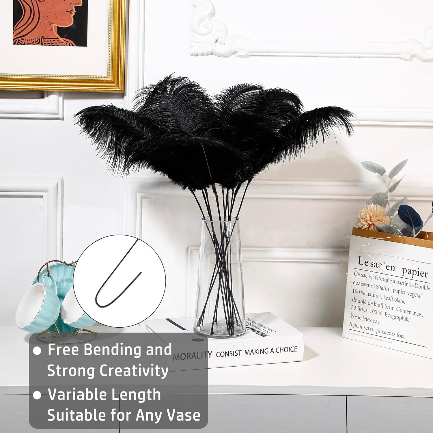 - 22inch Ostrich Feathrs Kit: 20pcs 10-12 inches black ostrich feathers, 20 pcs 10 inches long iron wire, and a 15m tape in the same color with the feather. Rich set content to meet your decoration and use needs