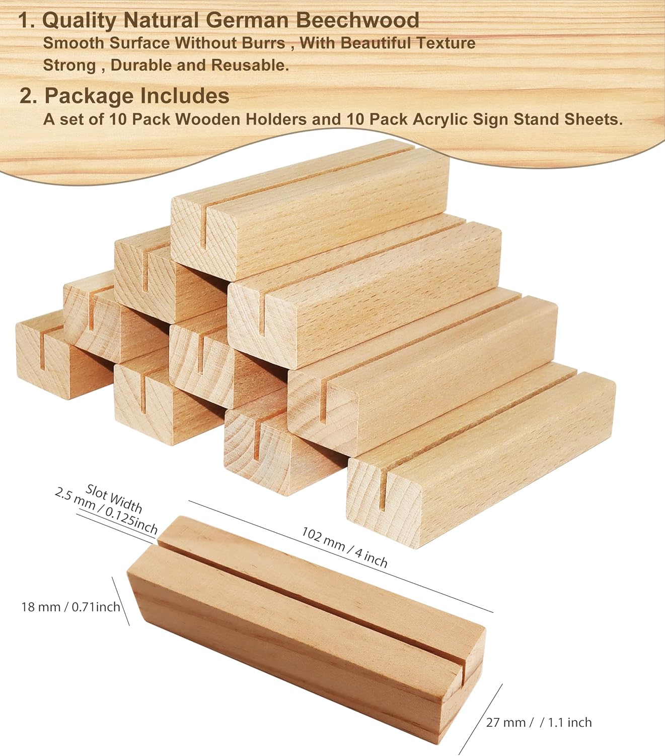 - Perfect Match - The package contains 10 pcs clear blank arch acrylic wedding signs and 10 pcs wood sign stands. Each acrylic sign measures 102x152x2mm / 4x6 inches, 1/8 inch thick๏ผand each wood stand measures 102x28x20 mm / 4x1.1x0.8 inches. Each acrylic pieces have a protective film on both sides to prevent scratches and when you are ready to use it, you should peel it off.