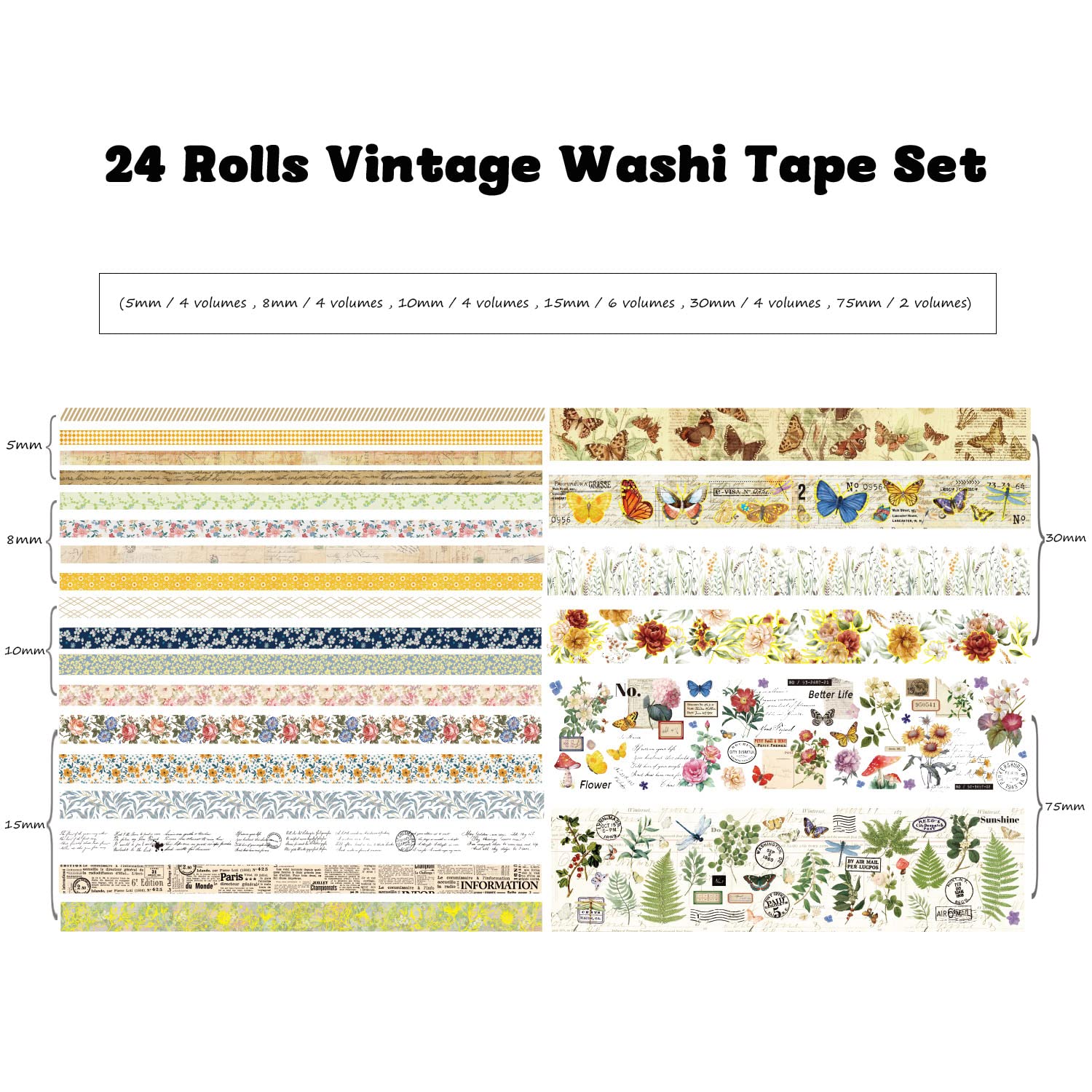 24 Rolls Vintage Washi Tape Set, Floral Letter Butterfly Mushroom Botanical Flower Writable Decorative Tapes for Scrapbooking , Junk Journal supplies, Bullet Journaling 5-75mm Wide 9.84ft long/Roll