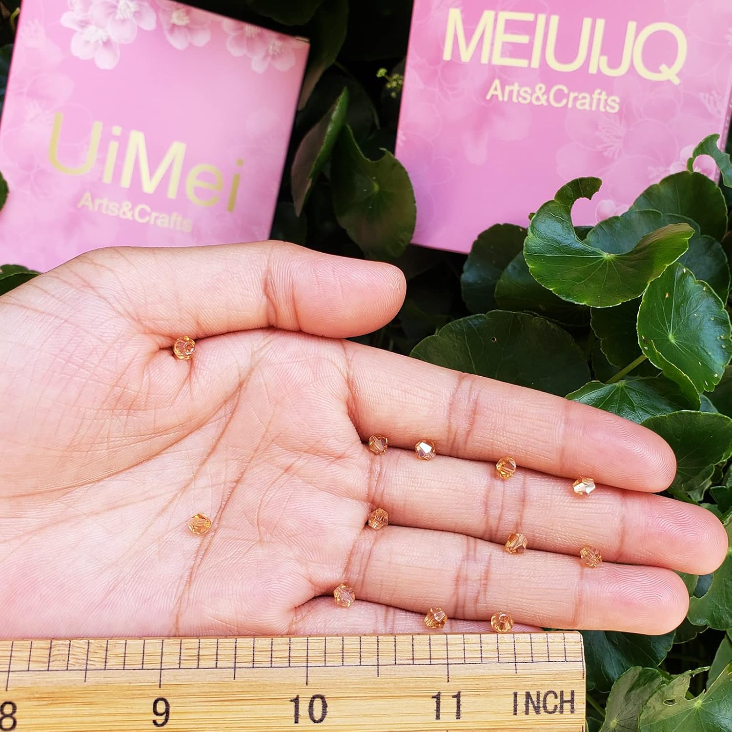 - 【PACKAGING and SIZE】 Package includes 1800Pcs 4mm Bicone faceted crystal glass beads in gold champagne AB color.Bead size: 4mm (or ~ 0.16 inch); Hole diameter ~ 0.9mm ( ~ 0.035 inch).In addition, we provide you with some stretchy cord and add an organza bag.Let your family and friends enjoy DIY happy time together.Kindly note: Please make sure this small bead size meets your needs before placing an order,thank you.