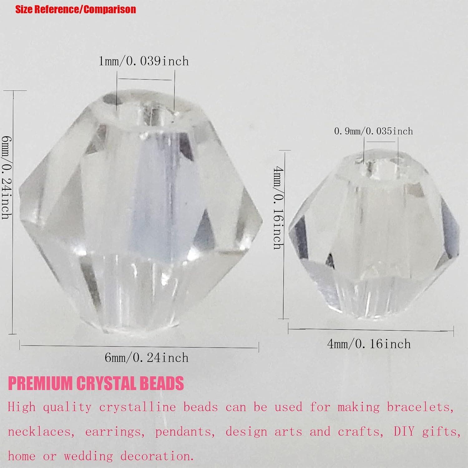 - 【PACKAGING and SIZE】 Package includes 450Pcs 6mm Bicone faceted crystal glass beads in white AB color. Bead size: 6mm (or ~ 0.24 inch); Hole diameter ~ 1mm ( ~ 0.039 inch).In addition, we provide you with some stretchy cord and add an organza bag.Let your family and friends enjoy DIY happy time together.Kindly note: Please make sure this bead size meets your needs before placing an order,thank you.