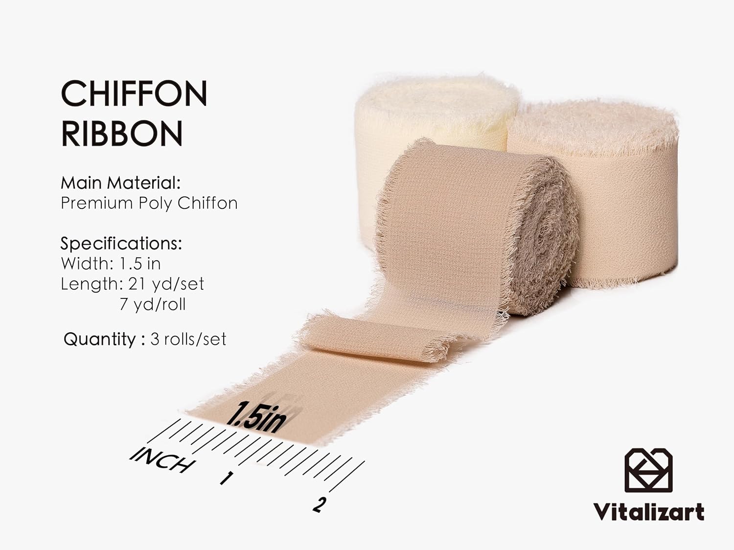 Vitalizart White Handmade Chiffon Silk Ribbon Fringe 1.5" x 21 Yd Nude & Ivory Frayed Edges Ribbons for Wedding Invitations Bridal Bouquets Gifts Wrapping Crafts Holiday Party Decorations