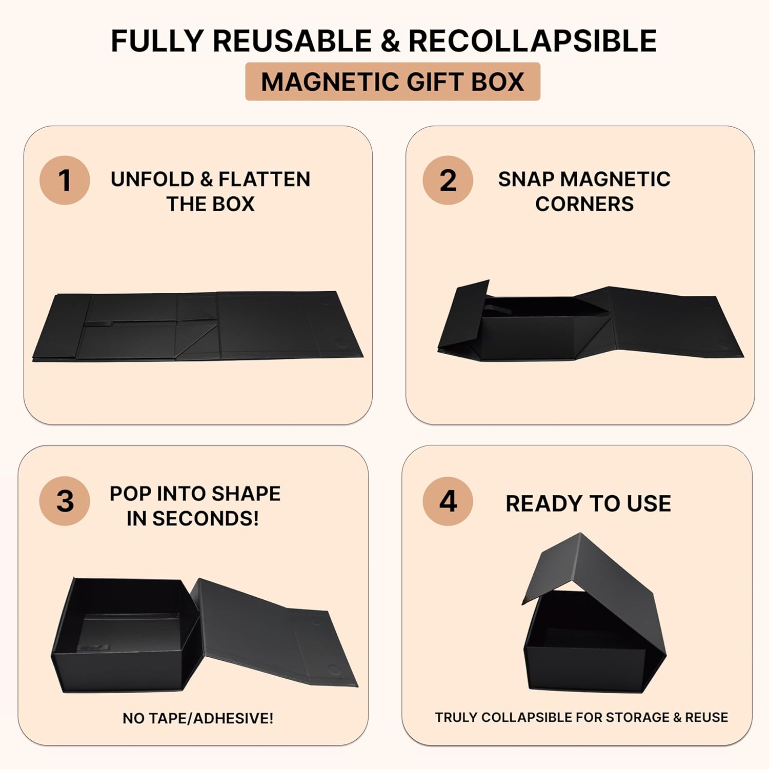 - 𝗘𝗔𝗦𝗬 𝗦𝗘𝗧𝗨𝗣 𝗪𝗜𝗧𝗛 𝗠𝗔𝗚𝗡𝗘𝗧𝗜𝗖 𝗖𝗟𝗢𝗦𝗨𝗥𝗘, 𝗡𝗢 𝗧𝗔𝗣𝗘 𝗡𝗘𝗘𝗗𝗘𝗗: Simply unfold the box, push down a flap, and pop the gift box into shape without tools or tape! The magnetic closure automatically closes and secures the box in shape with a satisfying and luxurious magnetic SNAP!