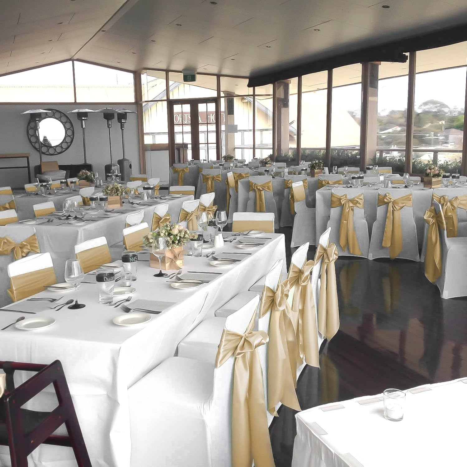 - ð¥¯ãDurable Satin FabricãOur chair sashes are made from 120GSM stain fabric, which is smooth, shiny, silky to the touch, vibrant in color. Shiny chair bows have a good decorative effect,create an elegant and romantic atmosphere.