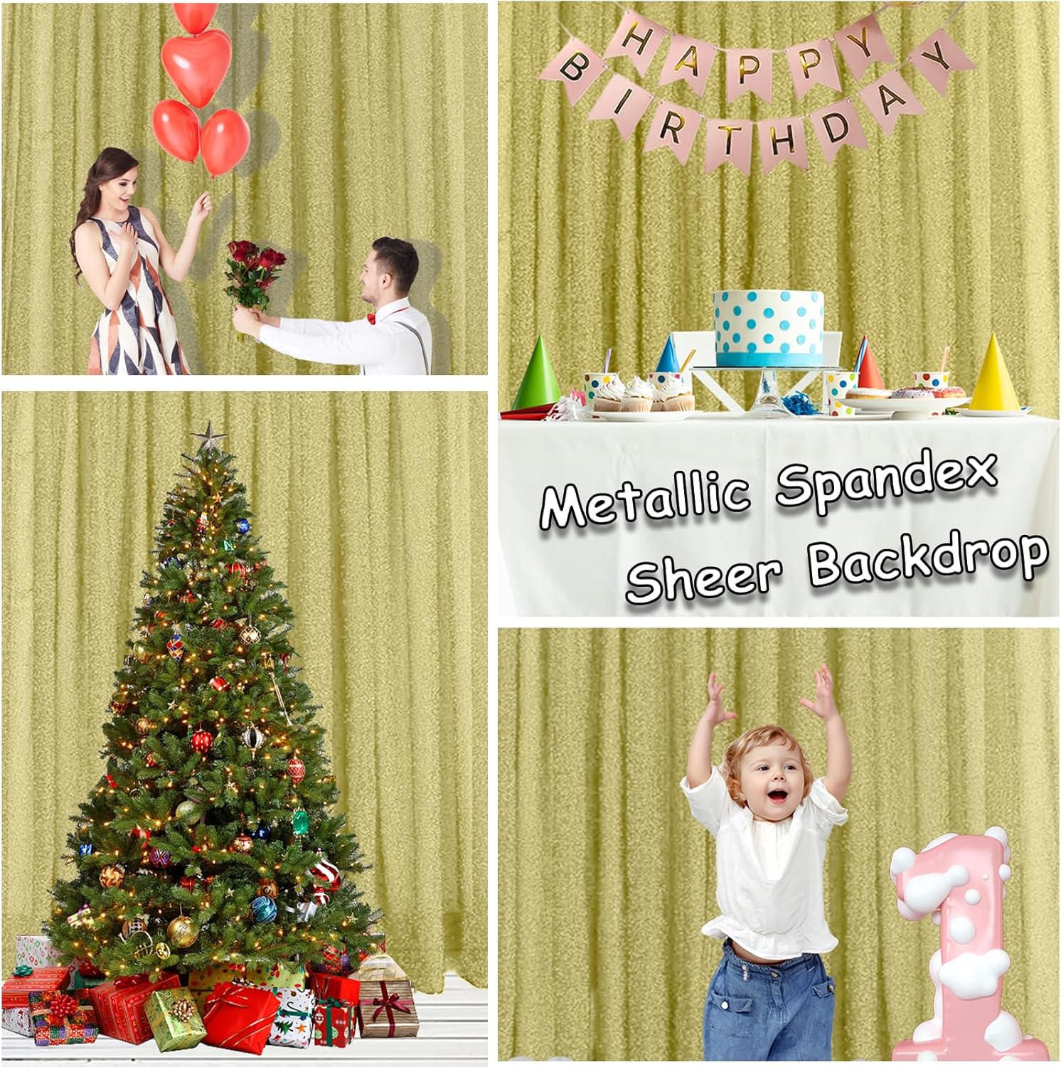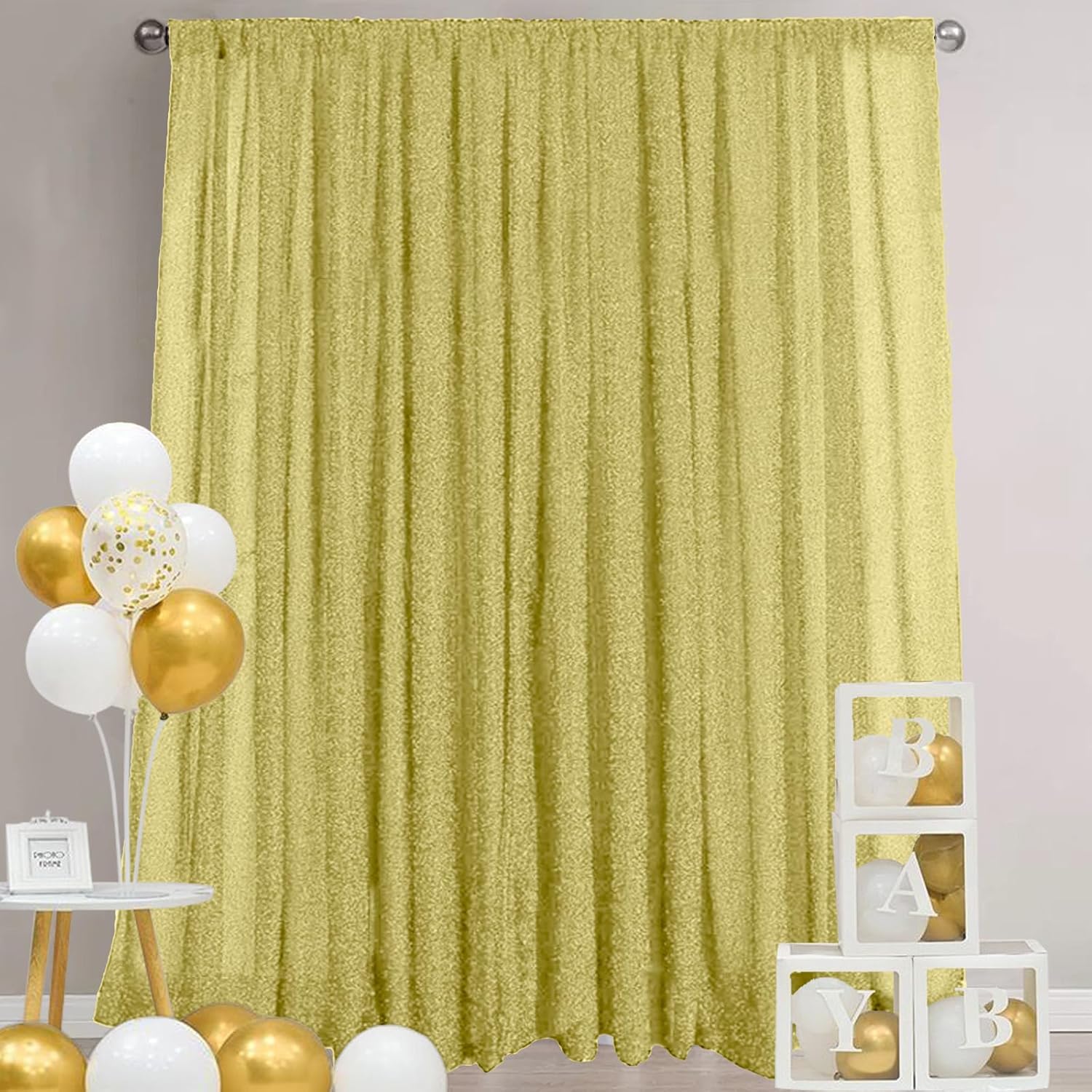 - [Stretch Backing + Shiny Polyester Thread] The champagne backdrop is made of spandex sheer fabric woven together with shiny polyester thread that has a slight stretch. The surface has a delicate metallic shimmer, which gives a high-class reflective effect when taking photos and easily enhances the splendor of the scene.