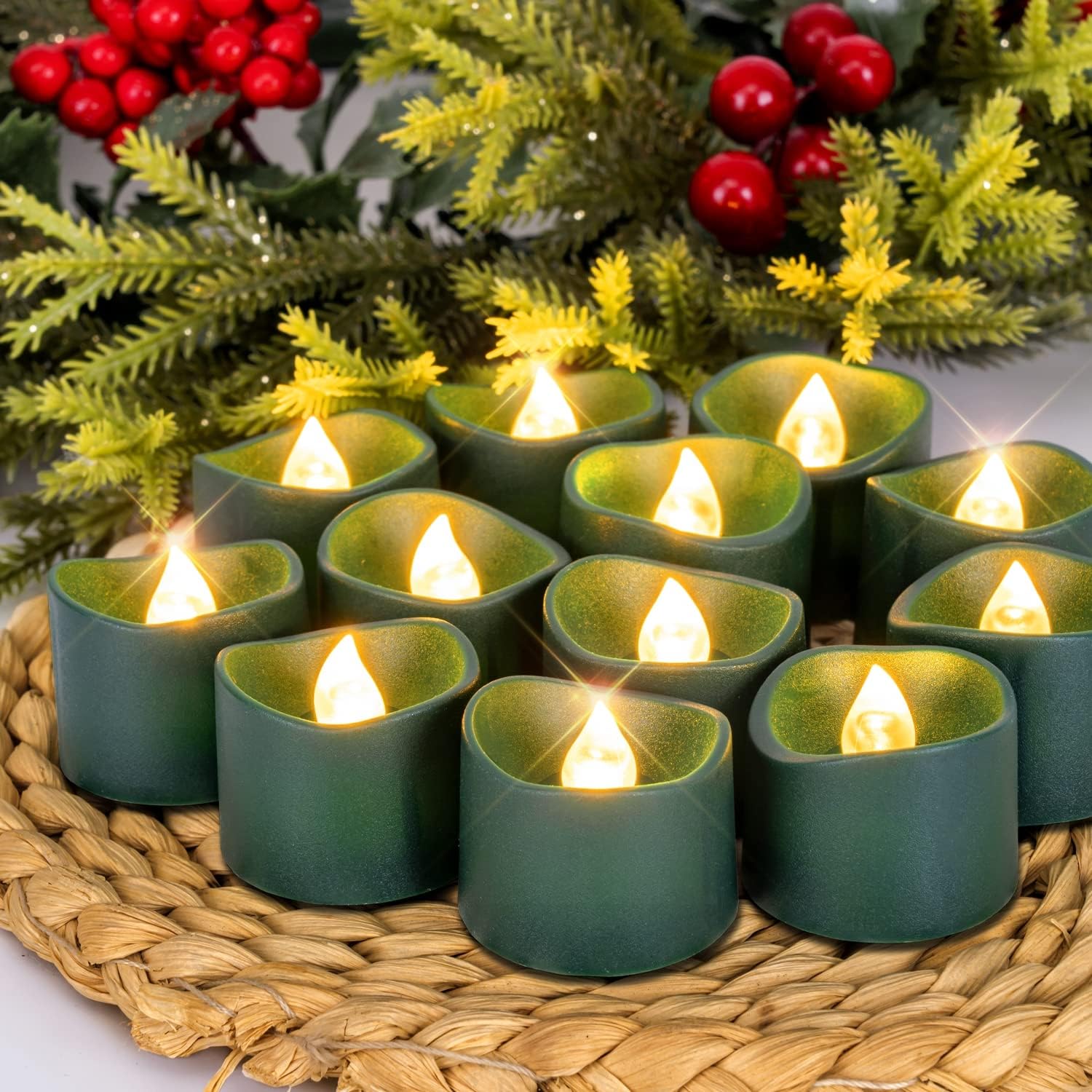 - FESTIVE & INVITING: Homemory green tea lights create a festive, inviting, or serene atmosphere, making them perfect for Christmas, St. Patrick's Day, garden parties, and other seasonal celebrations