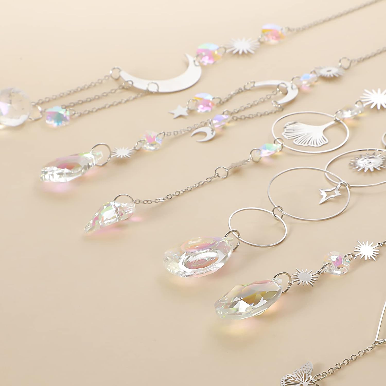 - Sun Catchers Specification: These 6 pieces colorful long chain suncatchers is made out by moon sun metal form frame and clear crystal balls, drops string. Ours are unique designs for decoration. With sun the prism crystal reflectiing, rainbows all around the room