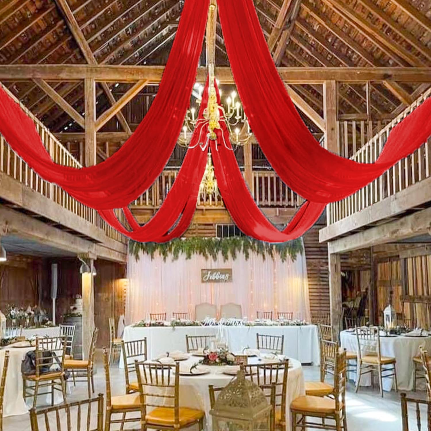- âQuality Material - Ceiling Drapery for Wedding: The material of wedding arch draoes fabric is premium sheer chiffon fabric, silky soft and wrinkle-free, sturdy and reusable. More graceful than other nylon fabrics. All edges of red ceiling panels are finished with with nice stitching. The wedding arch drapery is a good choice for party decoations, giving your events an elegant and romantic look.