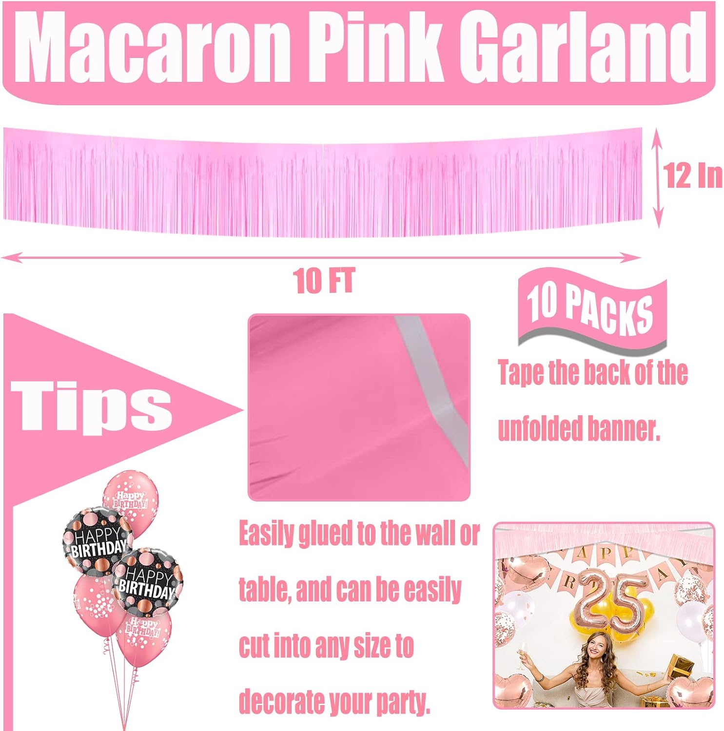 - 【Easy to Use】each metallic foil fringe garland comes with self-adhesive tape on the top for easy attachment to your wall or table, just peel off the tape and then stick, easy and fast to install.