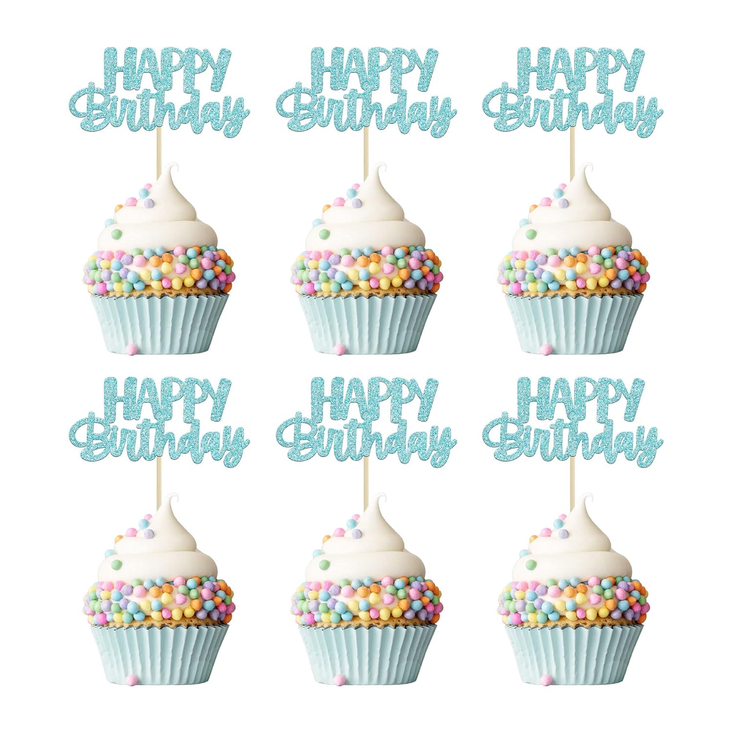 Gyufise 24Pcs Happy Birthday Cupcake Toppers Glitter Birthday Cupcake Food Picks for Celebrating Happy Birthday Party Cake Decorations Supplies Light Blue