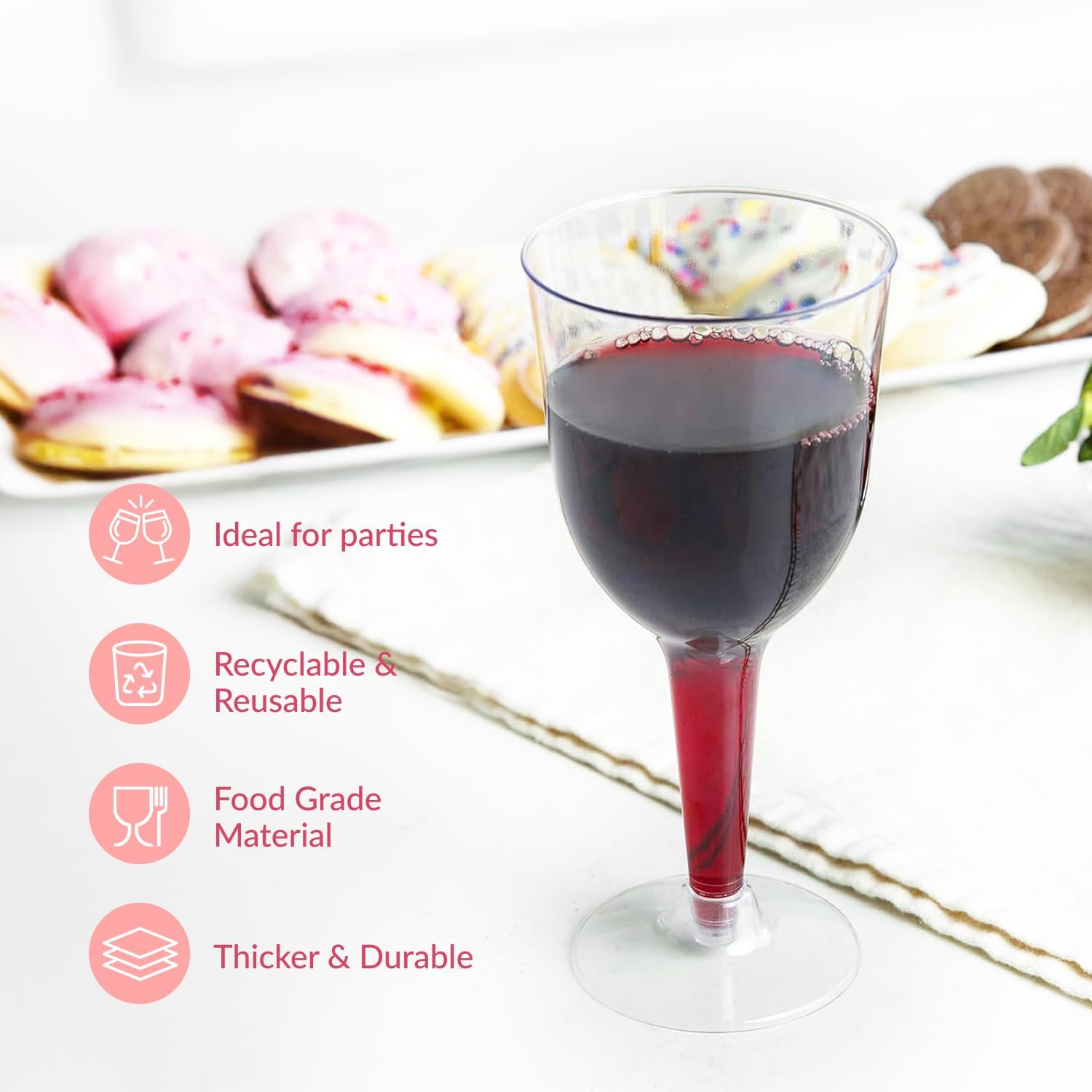 - PARTY WINE GLASSES: Make your celebrations memorable with these plastic wine cups Perfect disposable wine glasses for wedding, picnics, patio gatherings, baby showers, bachelerotte parties, barbeques, family reunions, and everyday use An awesome option if you are looking for plastic wine glasses with stem.