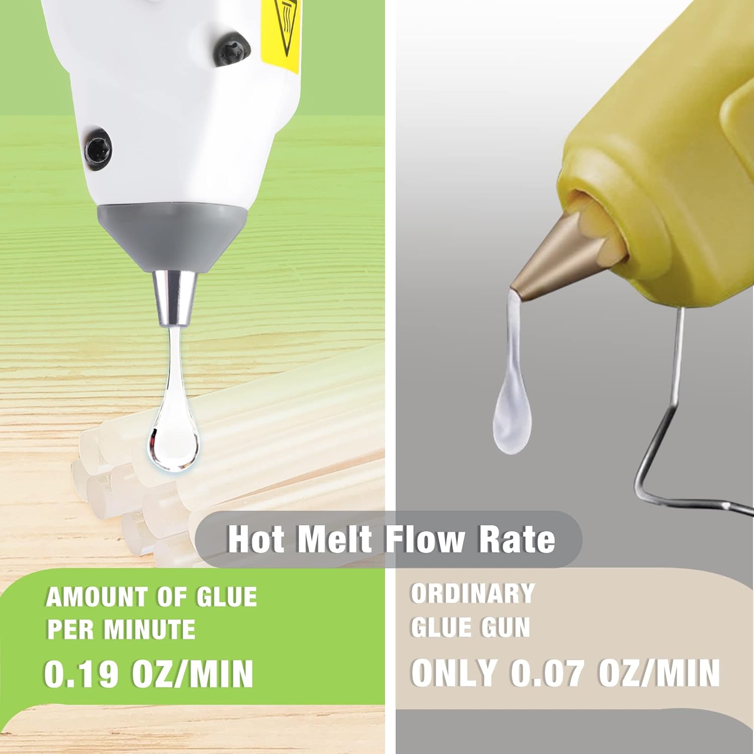 - Fast Glue Output: This wireless hot glue gun has a very fast glue output speed, dispensing 0.18oz/5g per minute, much faster than the 0.07oz/2g per minute of ordinary hot glue guns. The glue gun cordless also features a low-leakage nozzle design, effectively reducing glue spillage, saving more glue sticks, and keeping your work area clean. Additionally, the battery operated glue gun comes with a vertical stand that can be placed on a stable surface, making it convenient to use at any time
