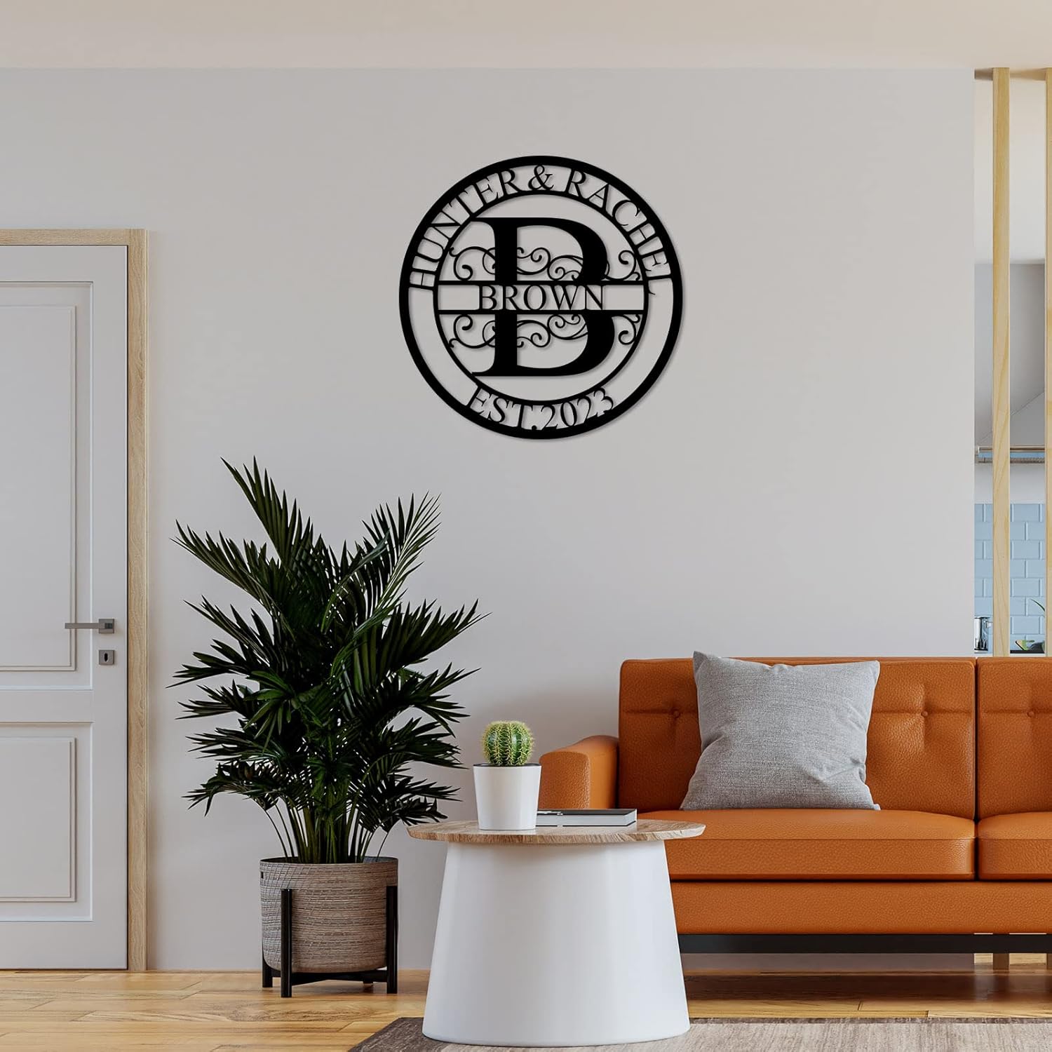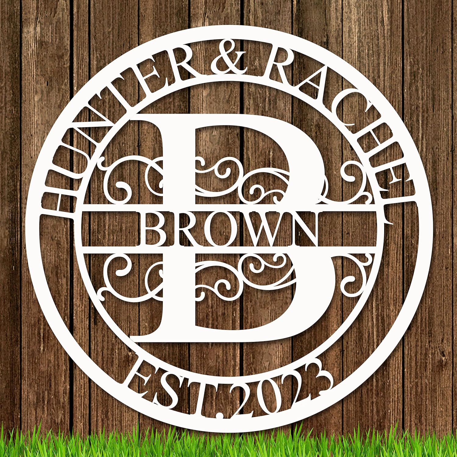 - ⭕ UNIQUE DESIGN: This custom metal name sign design is very unique. A simple circular design with the initials of the last name for the background. Add a family name and couple's name with the established date, to create a perfect family sign.