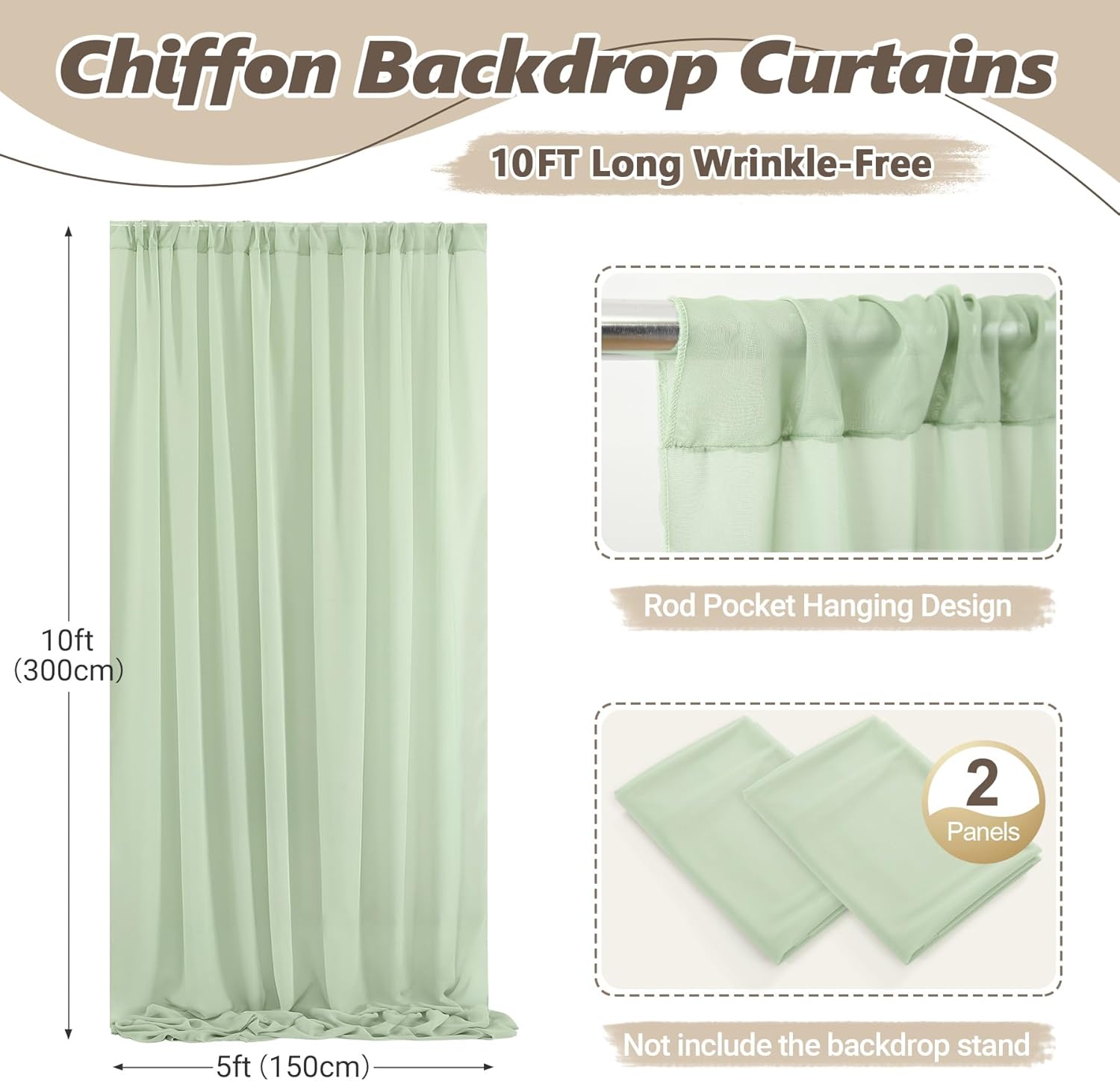 - 【Easy to Care】- The sage green chiffon backdrop curtains can be machine and hand washed in cold water with mild detergent; Use non-chlorine bleach. Tumble dry low. Low temperature iron if needed. The chiffon fabric is easy to clean!