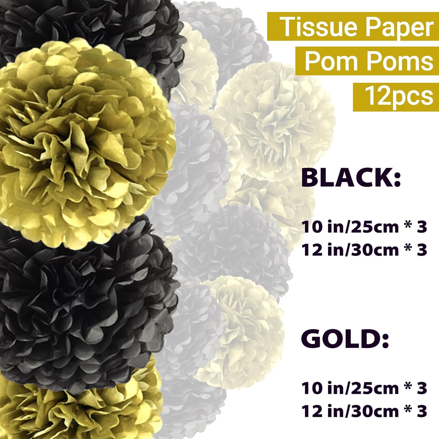 Capesaro Gold and Black Paper Pom Poms - 10",12" Tissue Decorations for Party Hanging Decor - 12 Piece Set