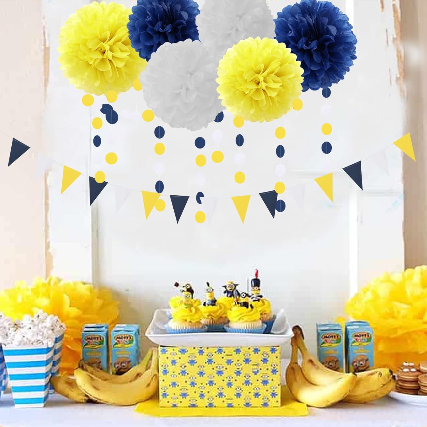 - 【Package Contains】The navy blue white yellow party kits include 6pcs tissue paper flowers: 3pcs 8" and 3pcs 10" in three color, 1pcs Triangle Flags,1pcs circle dots paper garland,15pcs tassel garland. Total 23pcs.