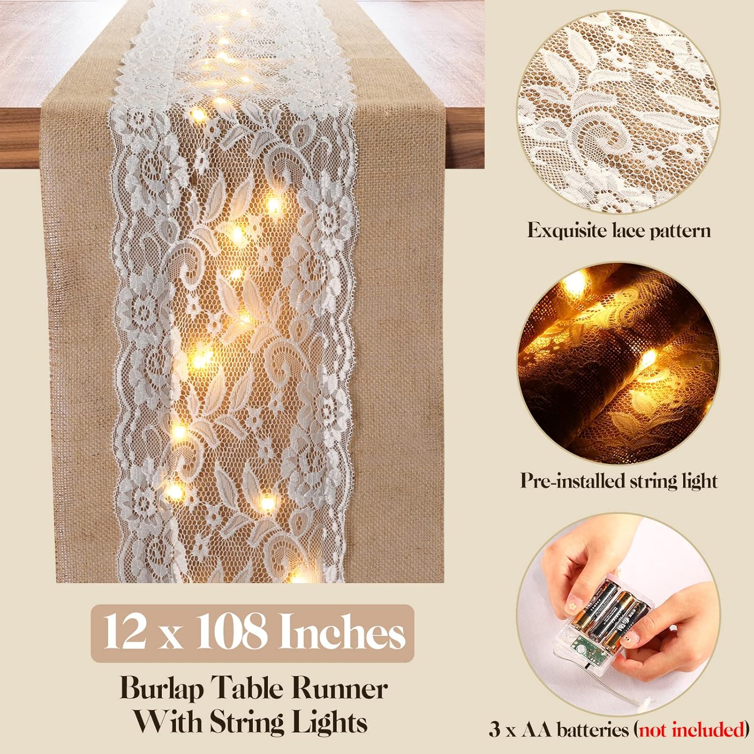 - Suitable Size: our rustic burlap table runner measures about 12 x 108 inches/ 30 x 275 cm, suitable for most of your tables; Each LED string light is about 13.12 inches long, each string light has 40 pieces of LED lamp beads, which can add charm to your party, batteries are not included