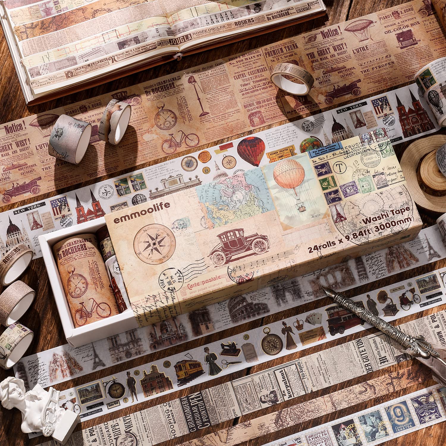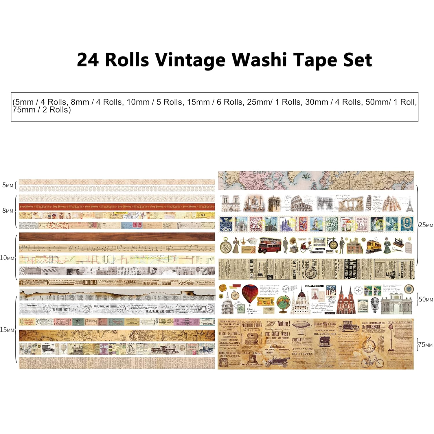 24 Rolls Vintage Washi Tape Set, Antique Car Buildings Map Stamp Stripe Writable Aesthetic Washy Decorative Tapes for Scrapbooking, Junk Journal Supplies, Bullet Journaling 5-75mm Wide (3m Long)/Roll
