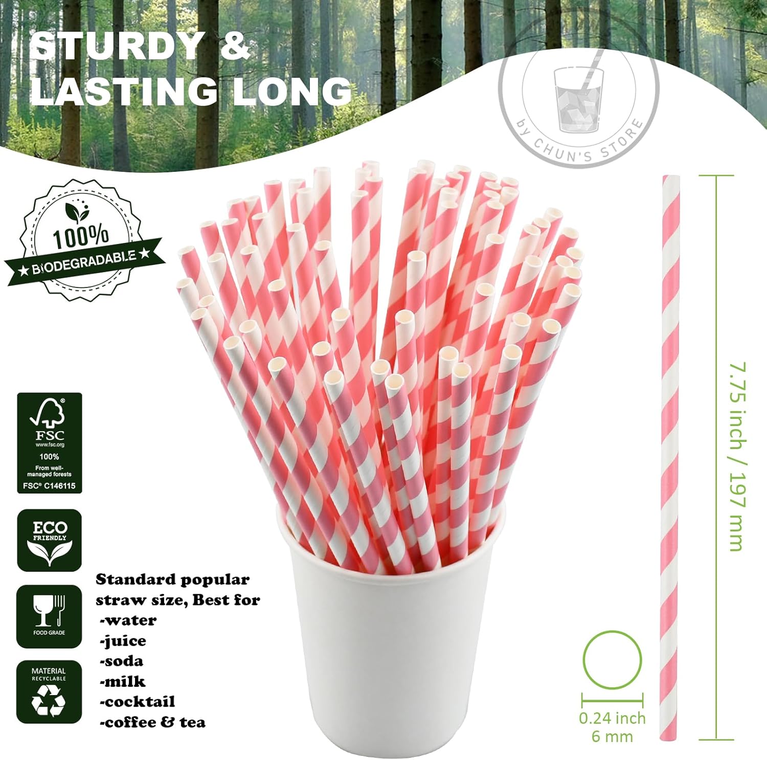 - Made from food grade paper, glue and ink. The paper of our straws are made from wood pulp originated from well-managed forest (FSC No.C146115)