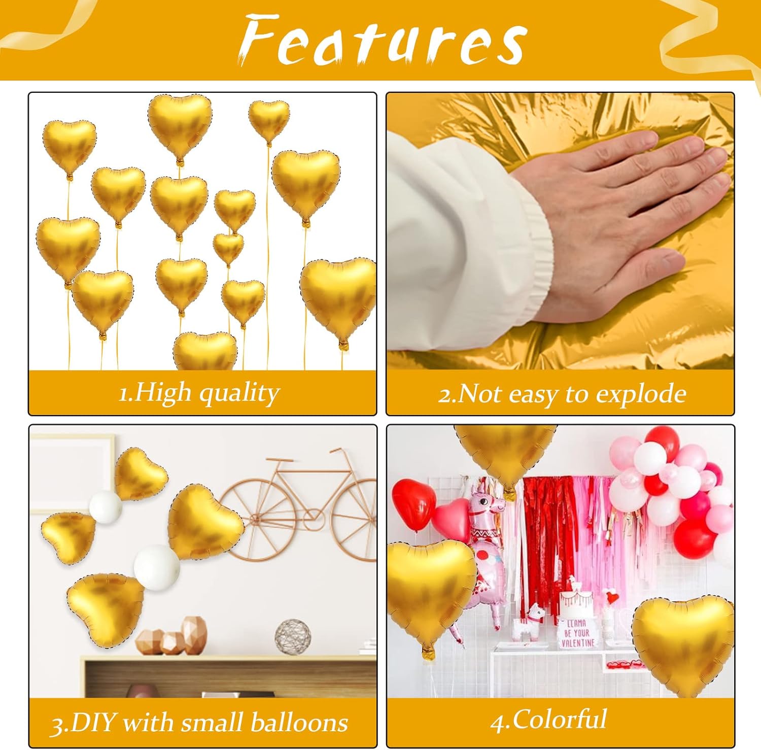 - š 10 PCS GOLD FOIL HEART BALLOONS: Package contains 10 x 18 inch gold heart balloons, 1 x 10m ribbon.The gold heart shape balloons are specially shaped, the perfect size for your holiday or party decorating needs, together create a fun and surprising party, leave an unforgettable smile!