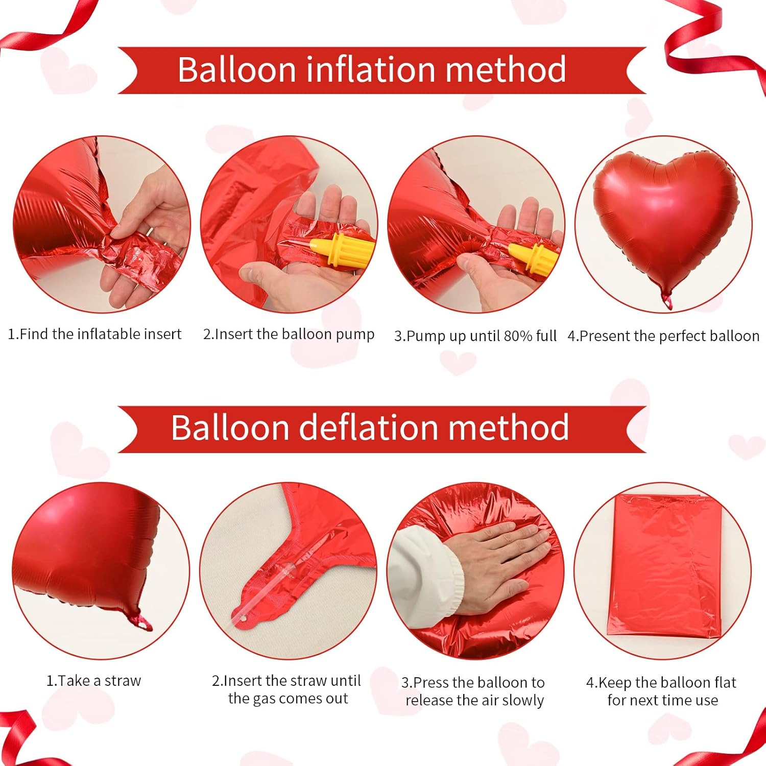 - š EASY TO USE: These red heart birthday balloons can be filled with air and helium (Inflate to 85%-90%, in case it is too large and explodes).The valve seals automatically when inflated, the gas inside can be emptied with a plastic straw, which can be reused later.Red valentines balloons set have 10 meters ribbon, you can decorate your room with balloons for your children and spouse.