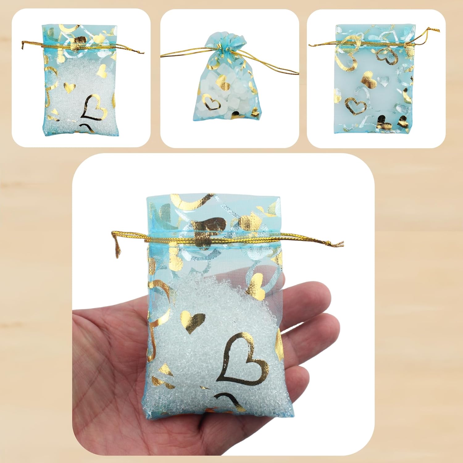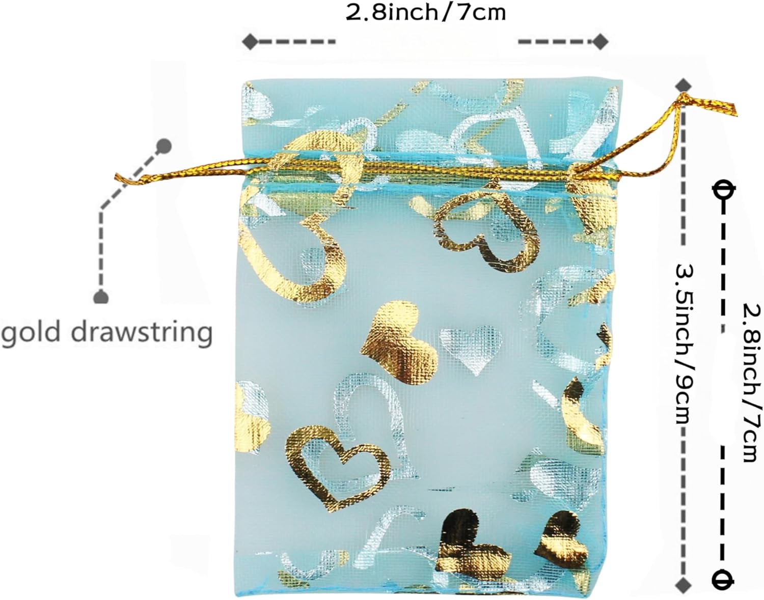 QIANHAILIZZ 100 Pack 2.8 x 3.5 Inch Flower Heart Organza Jewelry Gift Pouch Candy Pouch Drawstring Wedding Favor Bags B511S (turquoise gold heart)