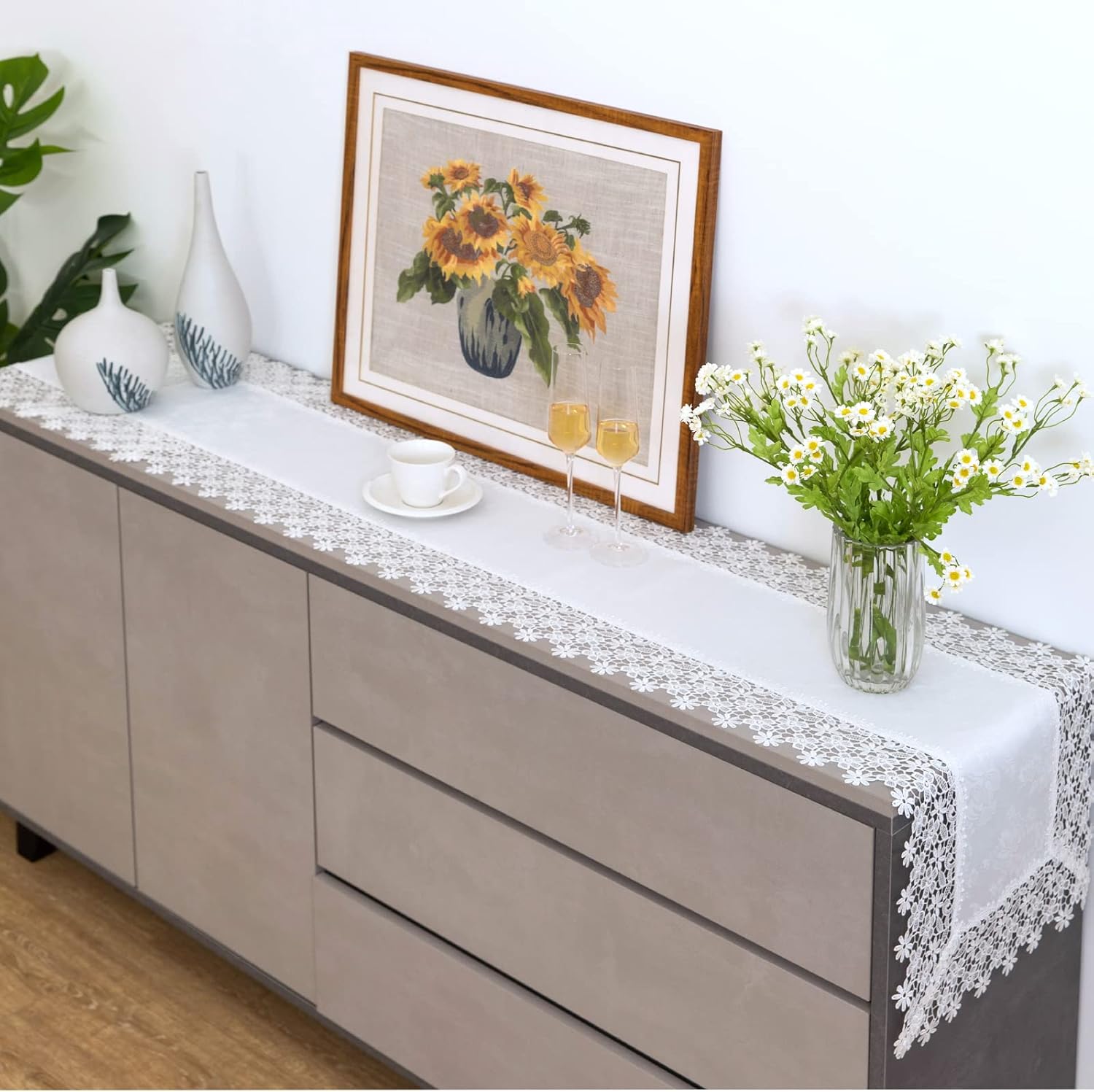 White lace Premium Rectangle Farmhouse Table Runner Waterproof OilProof SpillProof AntiShrink Soft Wrinkle Resistant Decorative Fabric Table Cover Kitchen Dinning Party Wedding Banquet