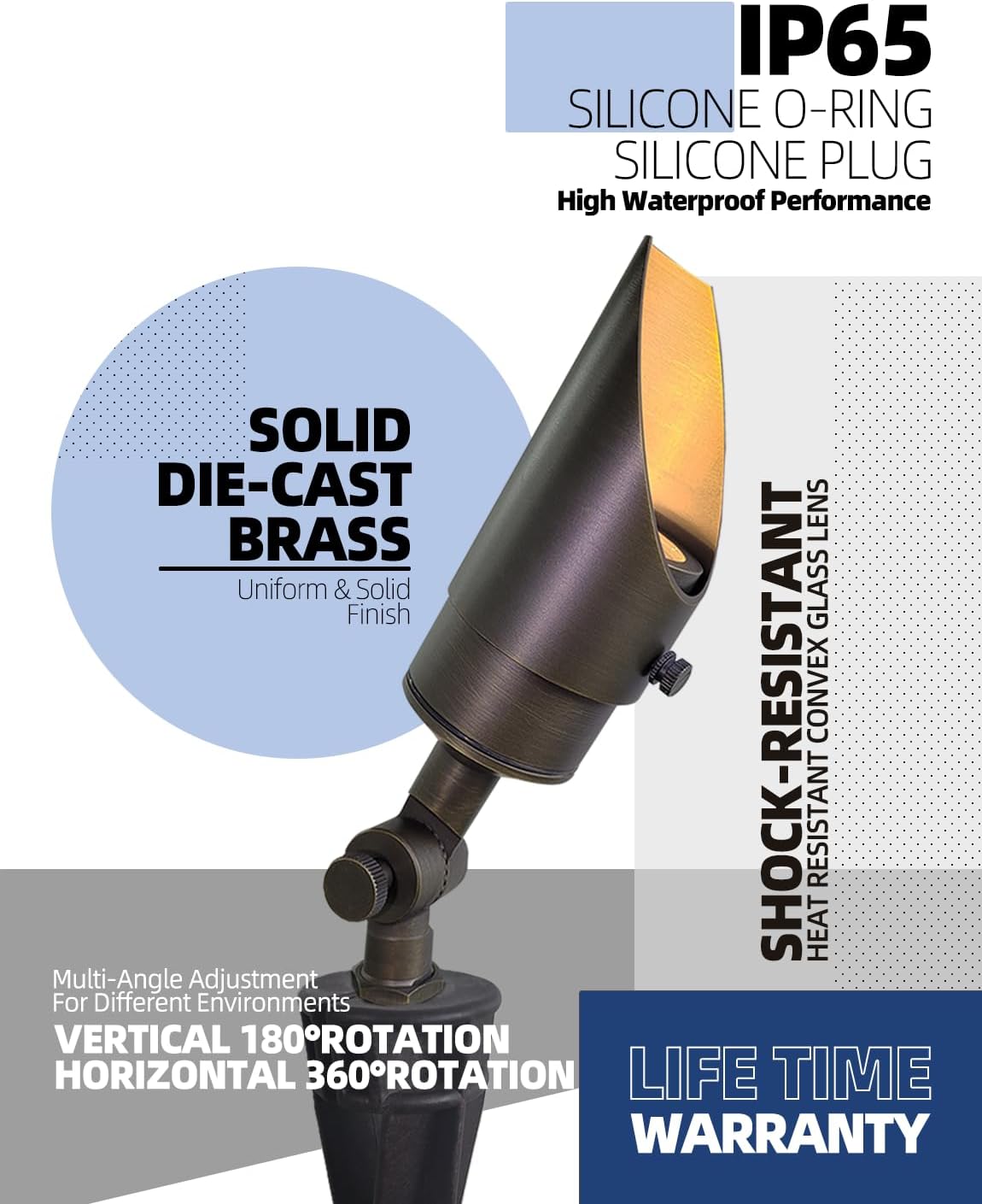 MALORY Brass Landscape Spotlight 12-Pack with MR16 Bulb Kit(S04), Low Voltage 12V AC/DC Shroud Adjustable Outside Yard Lights,PVC Ground Stake and Wire Connector Included, 5W 2700K Warm White