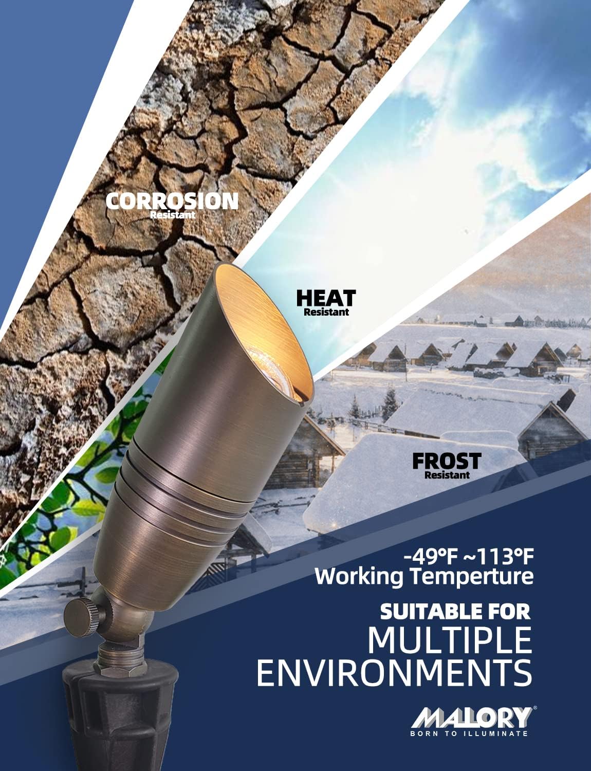 - BRASS LIGHT FIXTURE:MALORY landscape spotlight is constructed of die-cast brass for durability and beauty.Brass spot light doesn't corrode,more durable and reliable than aluminum and plastic fixtures,ideal for any uplighting application.Simple design structure for the light fixture make it looks beautiful yet unobtrusive in any landscape,suitable for decorating most houses and yards.