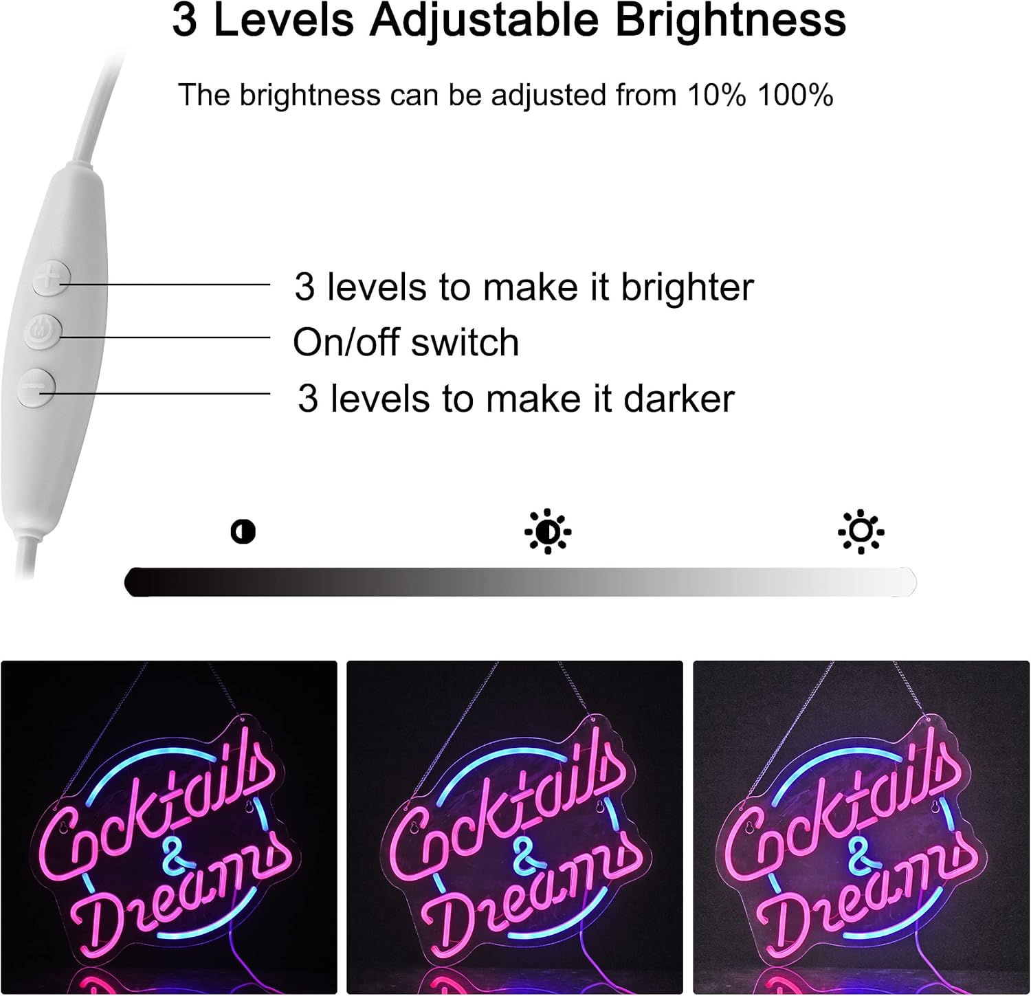 - The neon sign has dimmer on the switch , the brightness can be adjustabl
