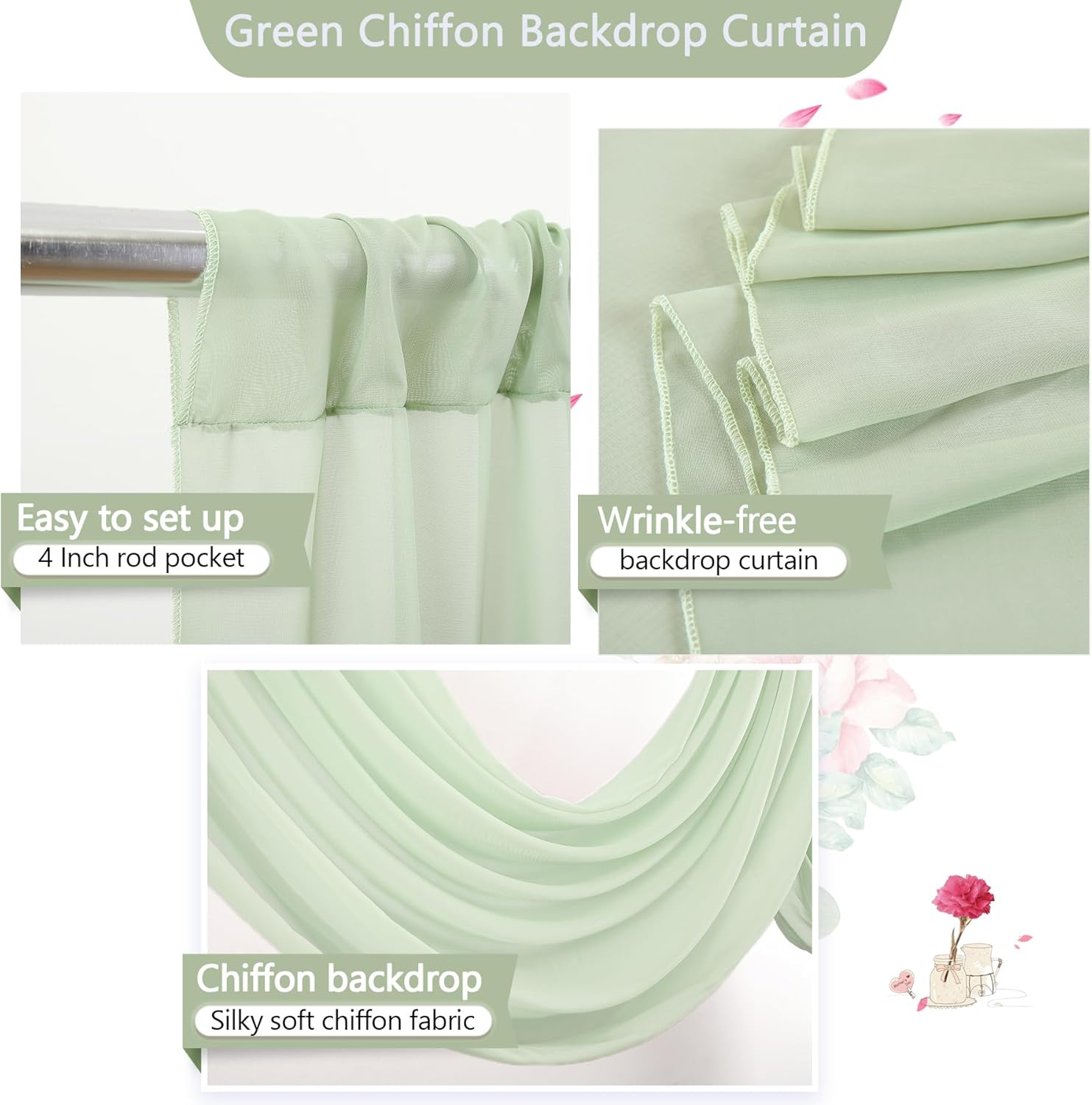 - 2 Panels Backdrop Drapes: Come with 2 panels Sage Green chiffon backdrop curtains,each panels size is 5ft width and 10ft height. Combined, entire backdrop curtains is 10ft*10ft. Please note: Not including the background stand