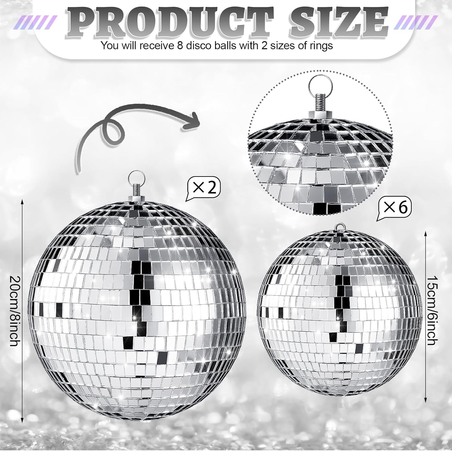 Haull 8 Pcs Large Disco Ball Set Silver Mirror Disco Reflective Ball with Hanging Ring Party Ornament Decoration for Stage Club Ballroom Dance Hall Wedding Prom Props(8'', 6'')