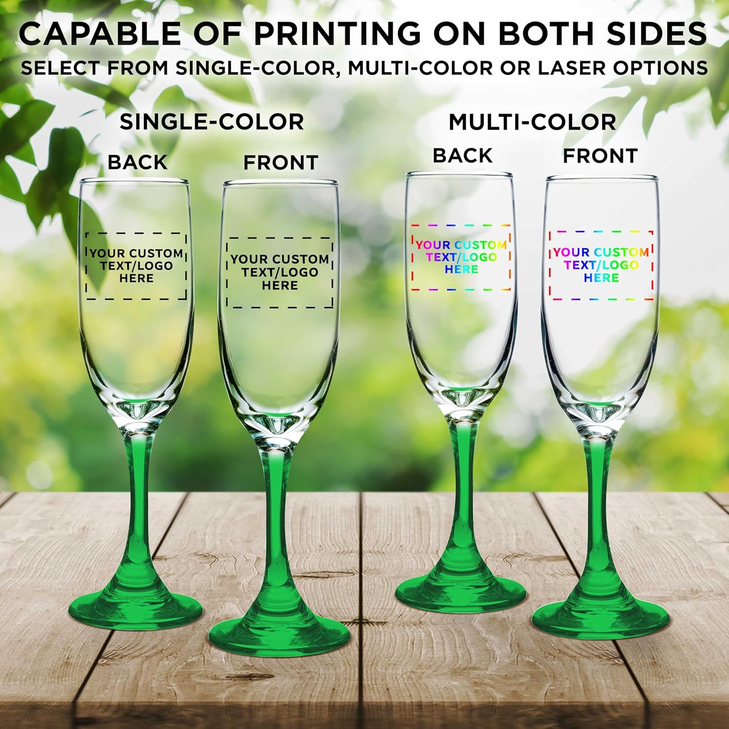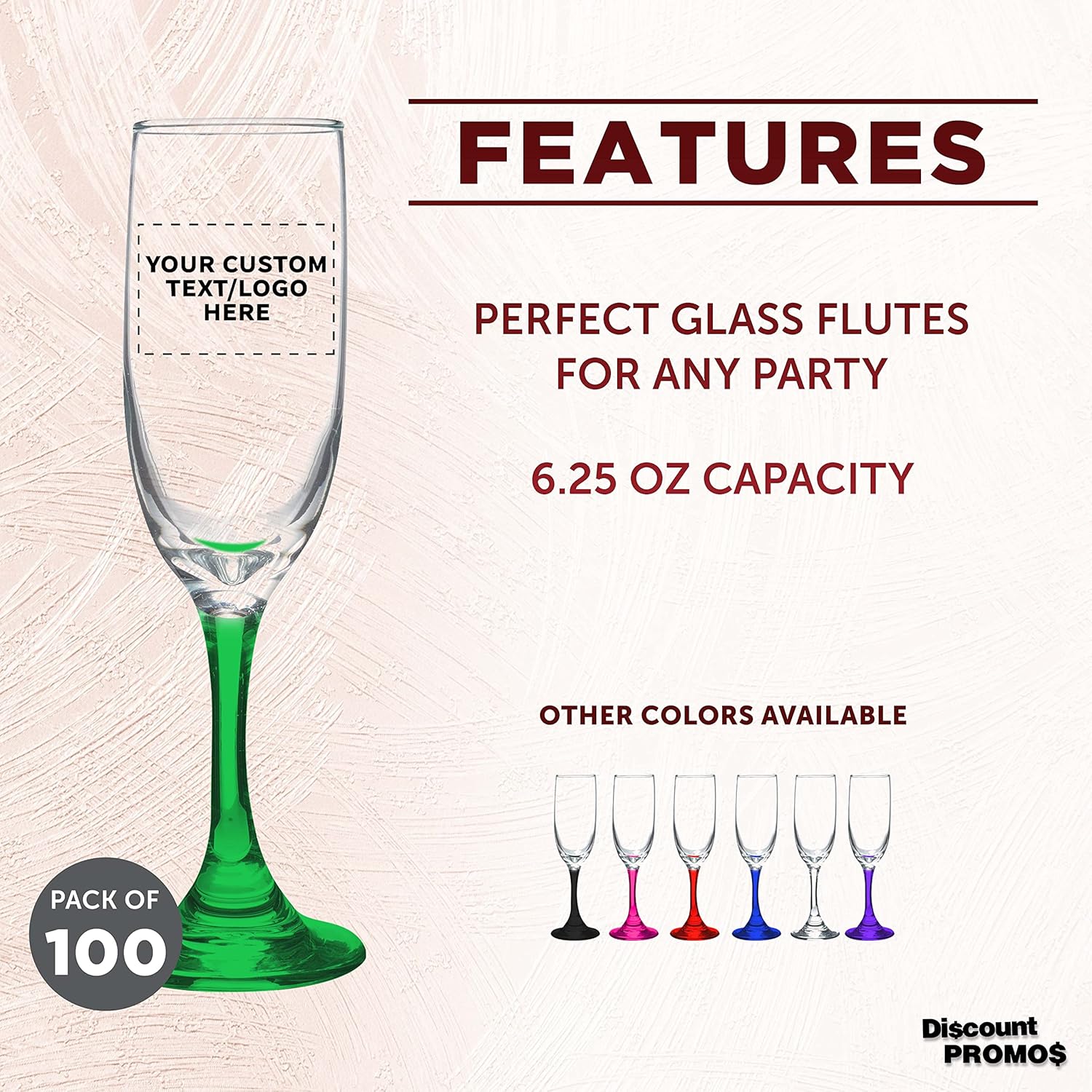 DISCOUNT PROMOS Custom Premiere Champagne Flutes 6.25 oz. Set of 100, Personalized Bulk Pack - Elegant Drinkware for Weddings, Events, & Promotional Gifts - Green