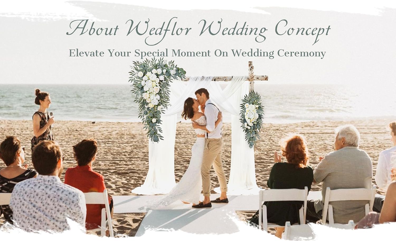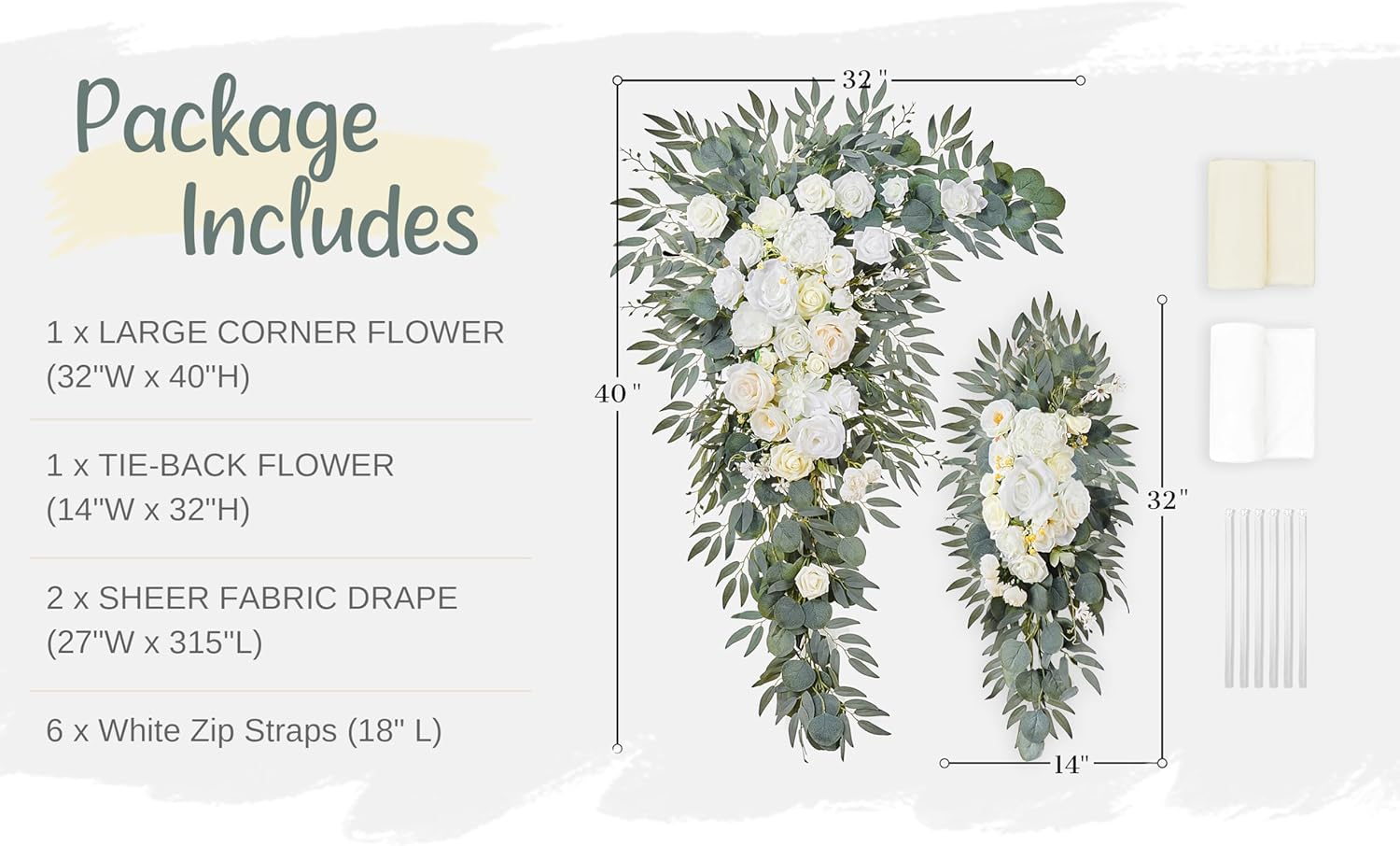 - PAKEAGE LIST: 1 x Large Corner Flower Swag of 32 "W x 40 "H + 1 x Large Tie-Back Flower of 14 "W x 32 "H + 2 x Hanging Sheer Drapes of 315 x 28 inch + 6 x White Zip Straps of 17.7 inch + 1 x Instruction Card + 1 x Glue Stick (Not include wood arch stand)