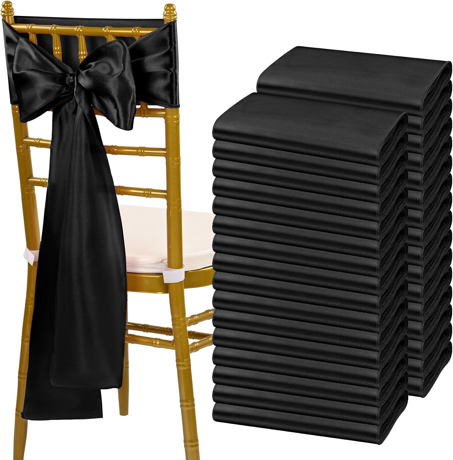 - šćPackage IncludećPack of 120 satin chair sash.Size: 7" x108" or 275cm(l) x 17cm(w).Each package includes chair sashes only, without chair covers.These chair ties bring a modern twist to your chair's settings and let your chairs sparkle brightly. Satin sashes can be tied into wedding chairs, draped across any decoration, or used as attractive table runners.
