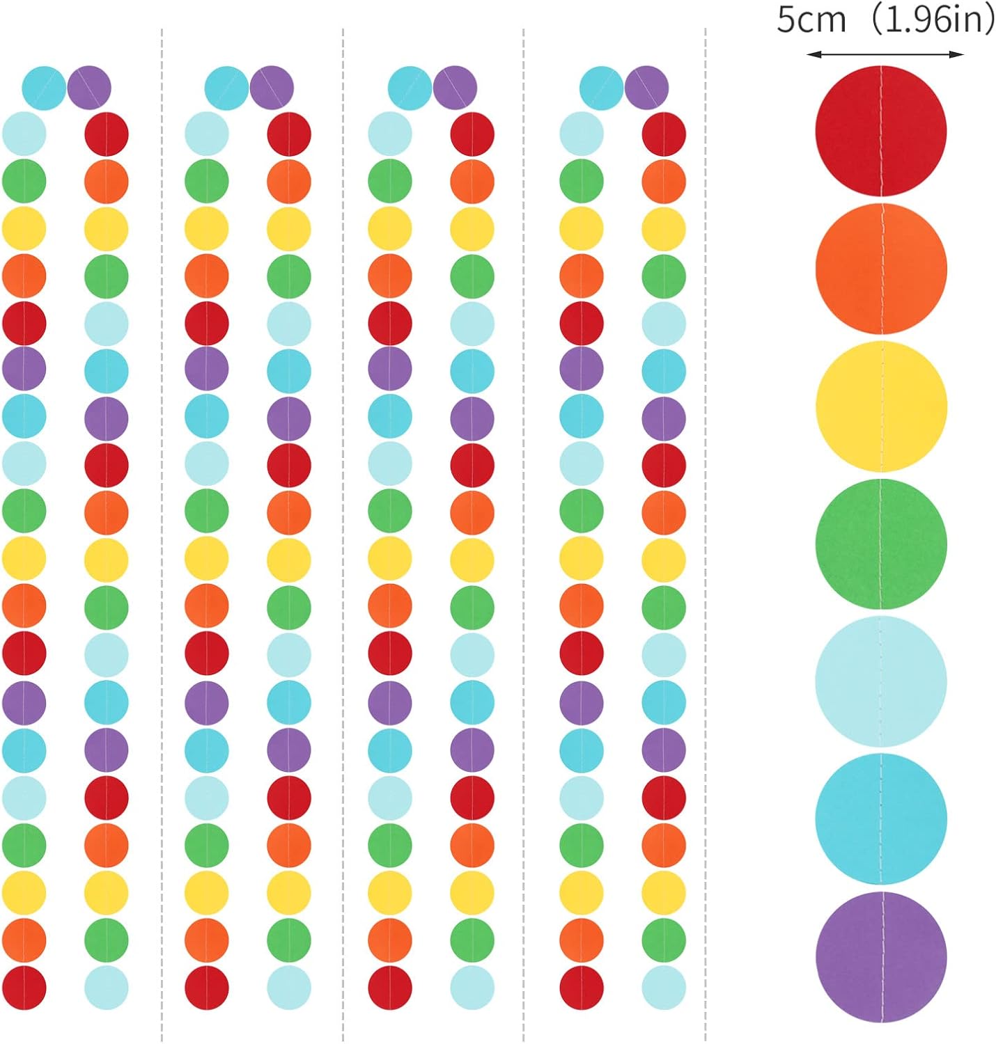 - 【Material】The material is eco-friendly colorful paper,red orange yellow green blue.You can cut to any length you want if you need shorter length.The dots are cut very neatly.