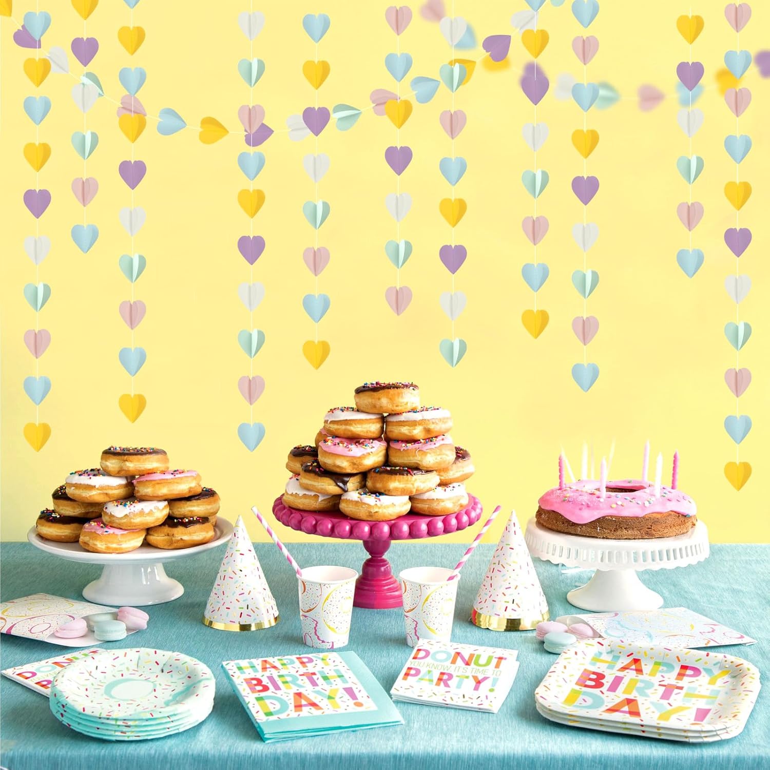 - 【Material】The heart is 2 dayers paper, please open them so they can have the 3D effect. The material is eco-friendly yellow blue pink purple mint paper.You can cut to any length you want if you need shorter length.The hearts are cut very neatly.