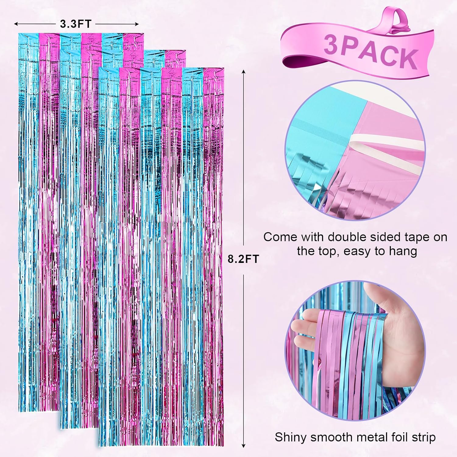 - Premium Material: This Blue and Pink foil curtain backdrop is made of stable tinsel, non-fading, stay shiny and reusable. Unfold it and then enjoy your glittering party