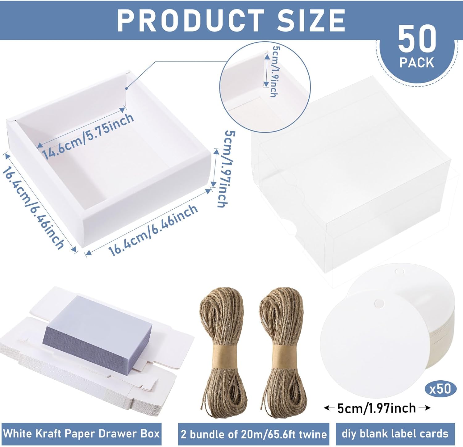 Roowest 50 Sets Kraft Soap Boxes Rectangle Packaging Box with Window Homemade Gift Box with Blank Tags and Jute String for Jewelry Candy Wrapping Party Favor(6.5 x 6.5 x 2 Inch,White)