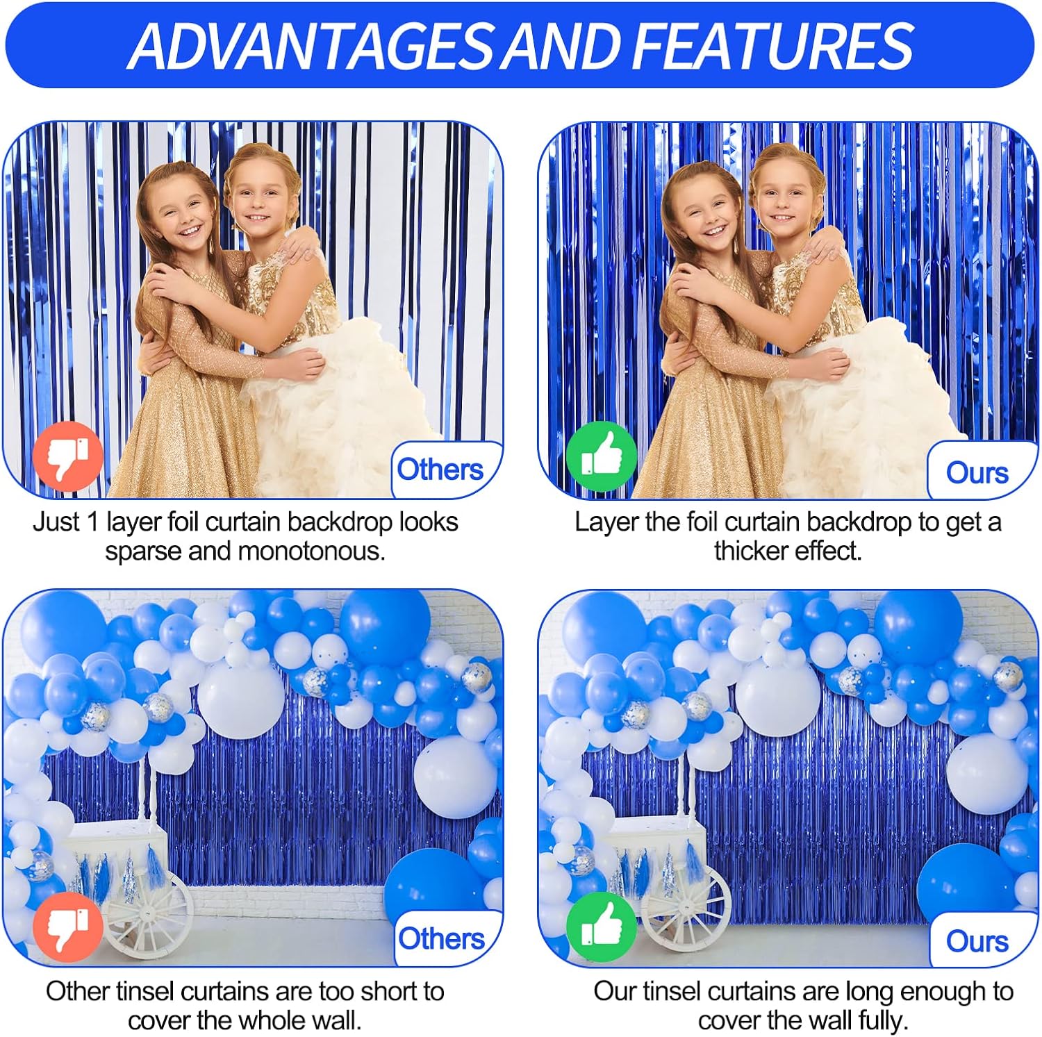 - Durable & Reusable - These party backdrop are made of durable tinsel with a shiny surface, which will keep the shimmer effect all the time, so they can be reused at another time, and light up your parties every time.