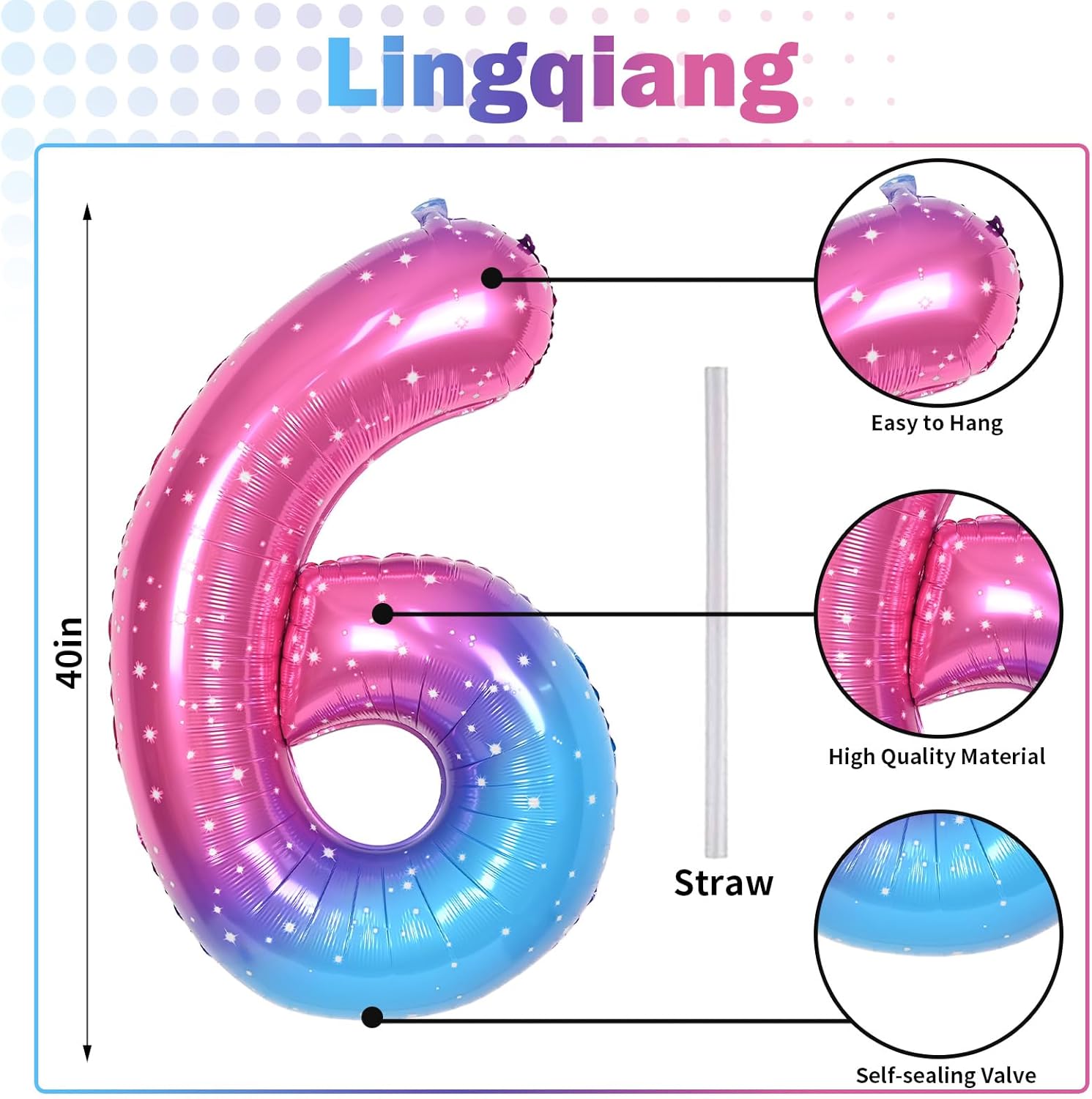 - š Gradient Rainbow Number 6 Balloon š - You will get 1pc 40 inch mylar foil pink blue starry number 6 balloon and 1pc straw. Perfect for 6th 16th 26th 60th 65th birthday or anniversary party decorations supplies.