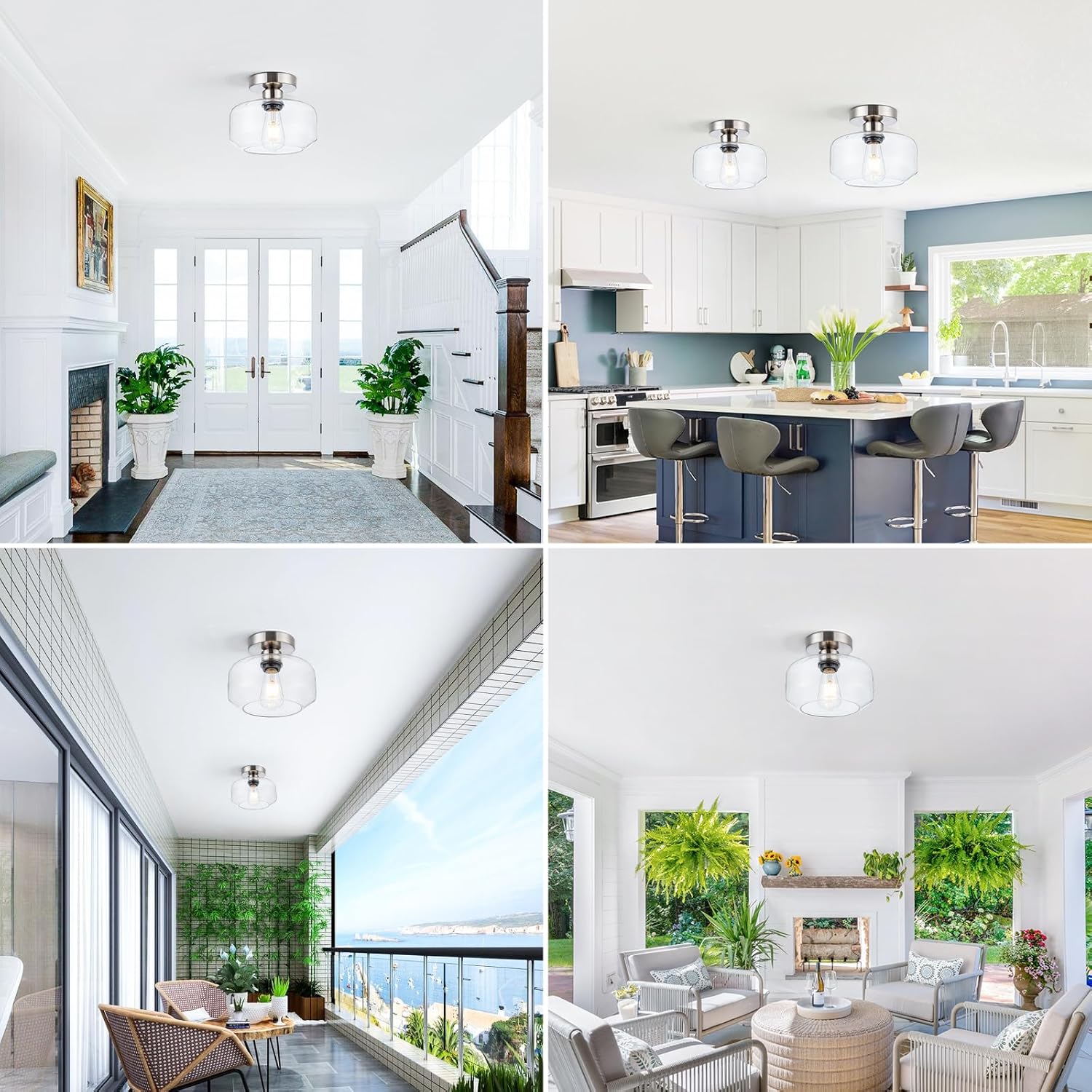 - ⨠Premium Semi Flush Mount Design 1.Retro-modern brushed nickel ceiling light with hand-blown clear glass shade offering crystal-clear transparency. Rust-resistant metal base fits farmhouse, vintage and modern decors. Perfect as hallway light fixtures or bathroom ceiling light.