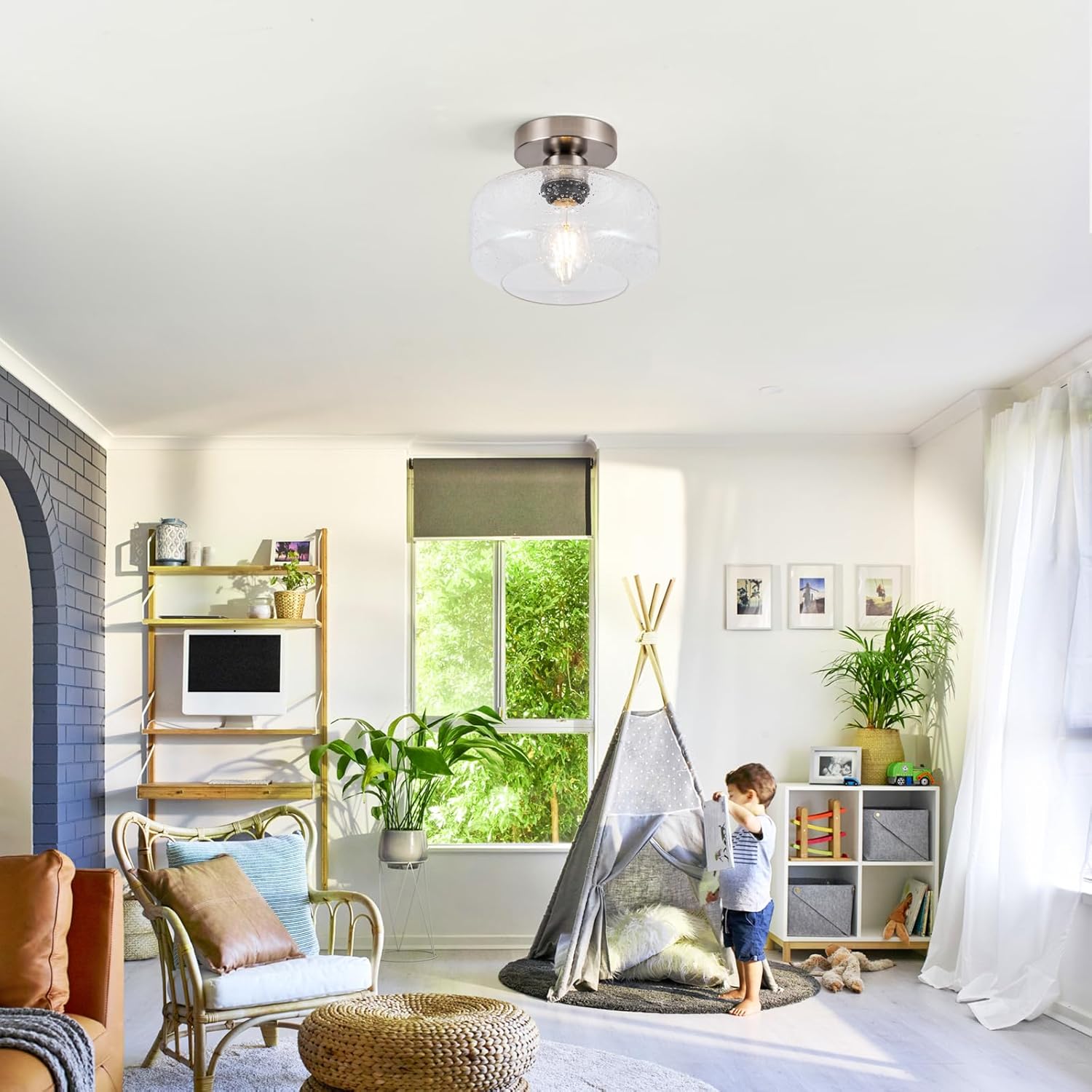 Semi Flush Mount Ceiling Light, Vintage Style - Clear Seeded Glass & Brushed Nickel with 900 Lumens LED Bulb Included, Suitable for Kitchen, Bathroom, Hallway, Bedroom, Entryway