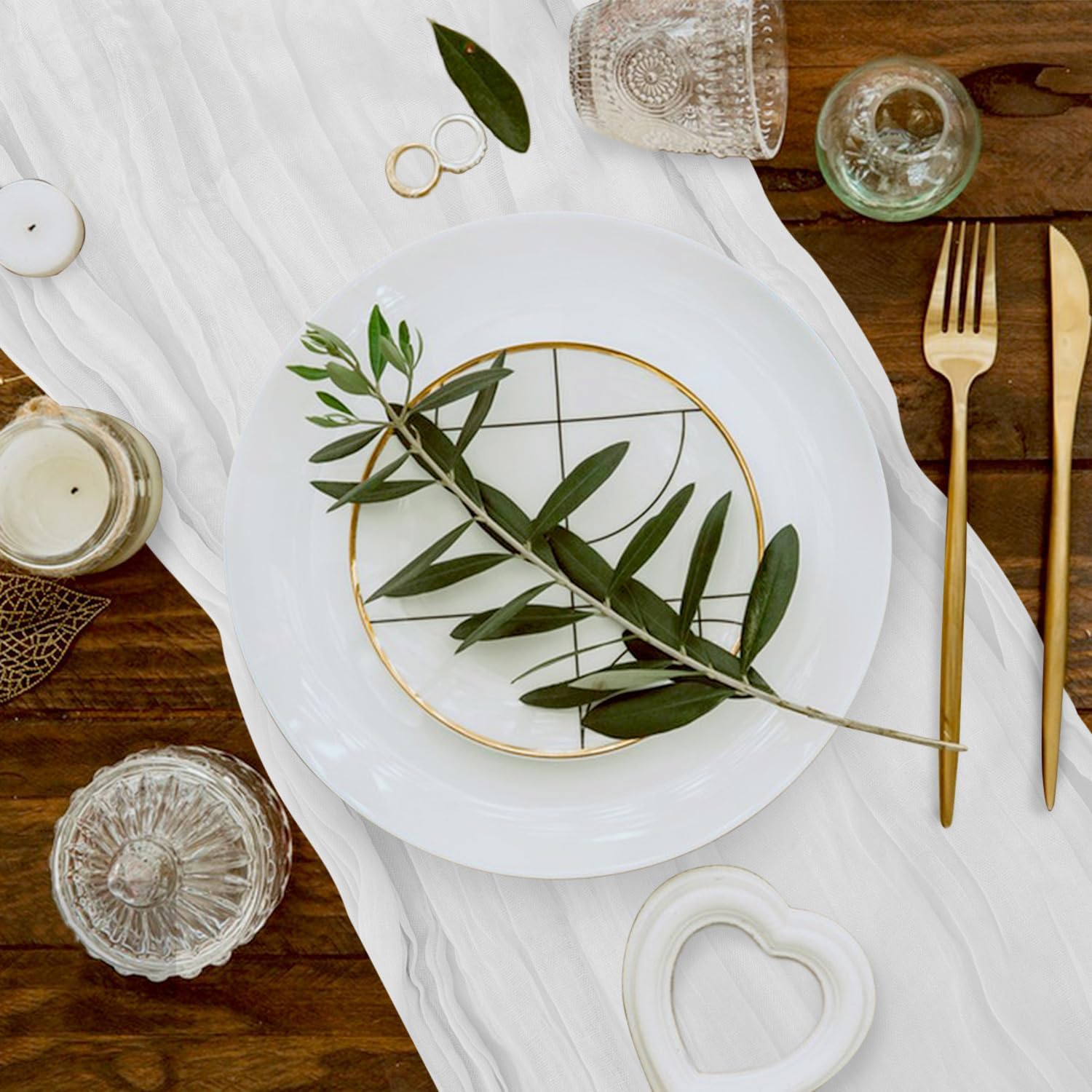 - 【Soft Material】: Made of high quality polyester, soft to touch, comfortable and durable. Wrinkled design cheese cloth farbic, delicate edges and stitches, adopts seamless technique makes this sheer table runner more graceful than traditional fabrics. Our cheesecloth wedding table runners are durable, the colour stays for a long time, does not fade and can be reused.