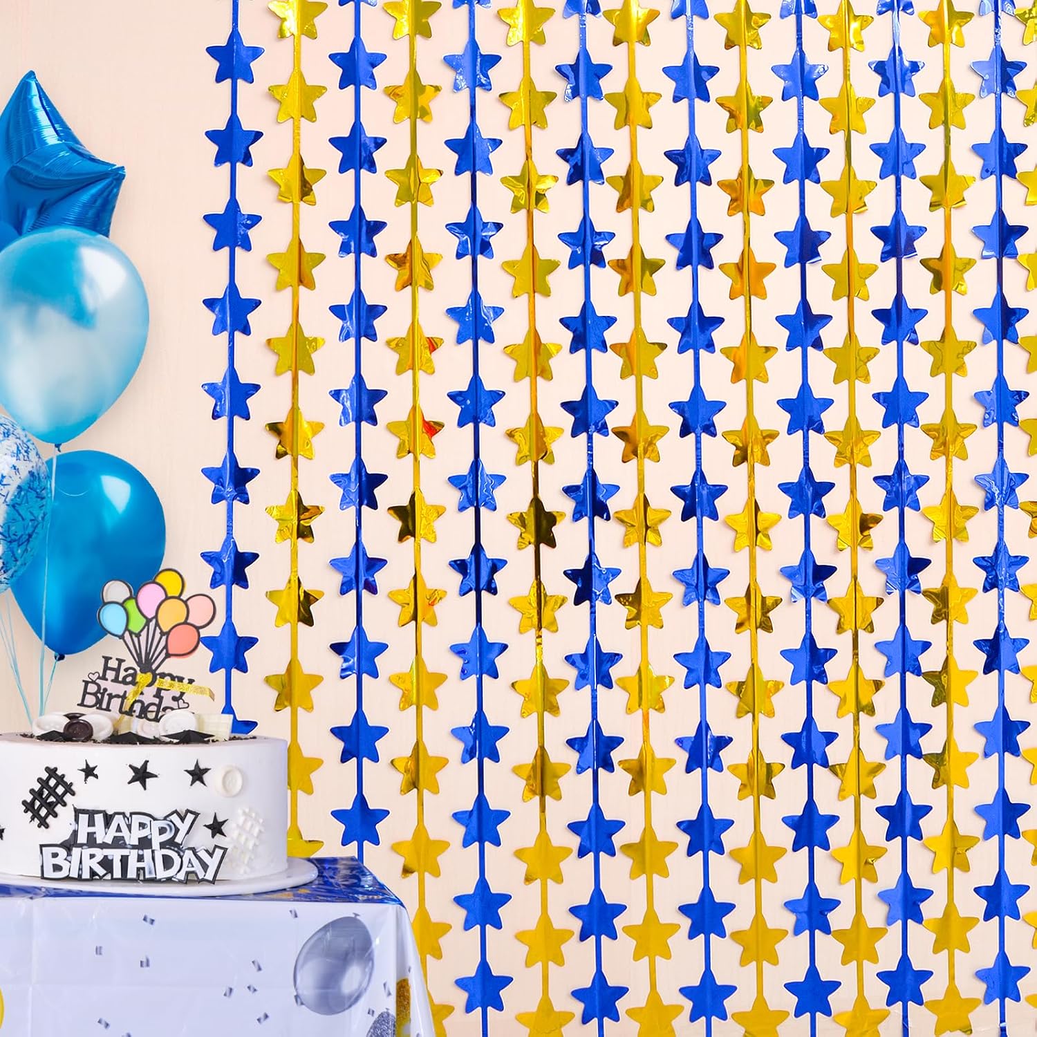 - šć TINSEL MATERIAL ć: These blue and gold star metallic foil fringe curtains are made of tinsel. They are lightweight and durable fringe curtains. These high-quality fringe curtains are tough, unbreakable, and can be used for a long time.