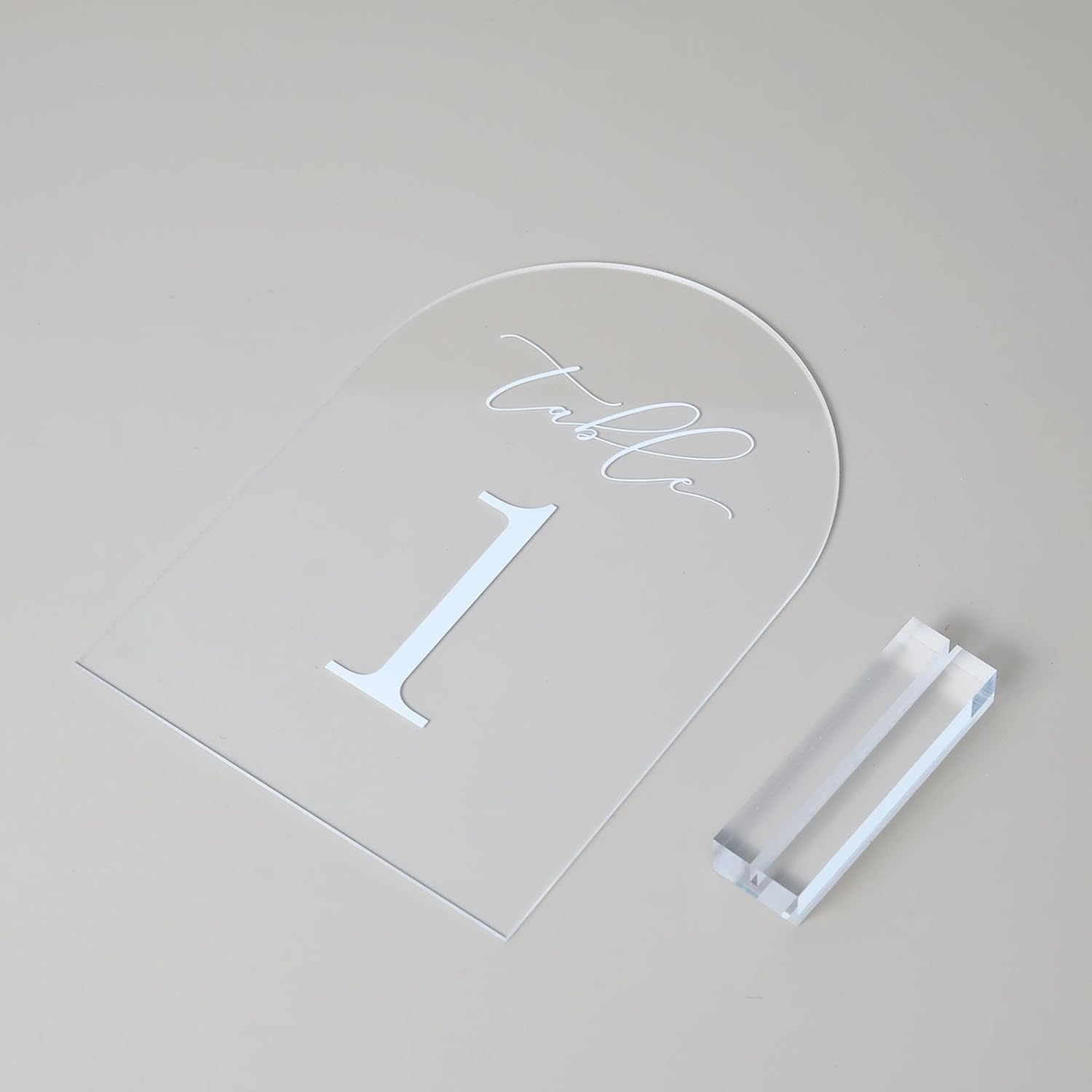 - Clear Arch Table Numbers with Acrylic Stands: Arched acrylic is so on trend for this year's wedding decorations. These gorgeous arch acrylic wedding table numbers will look stunning on your tables and go with any wedding style, from rustic through to timeless and classic.