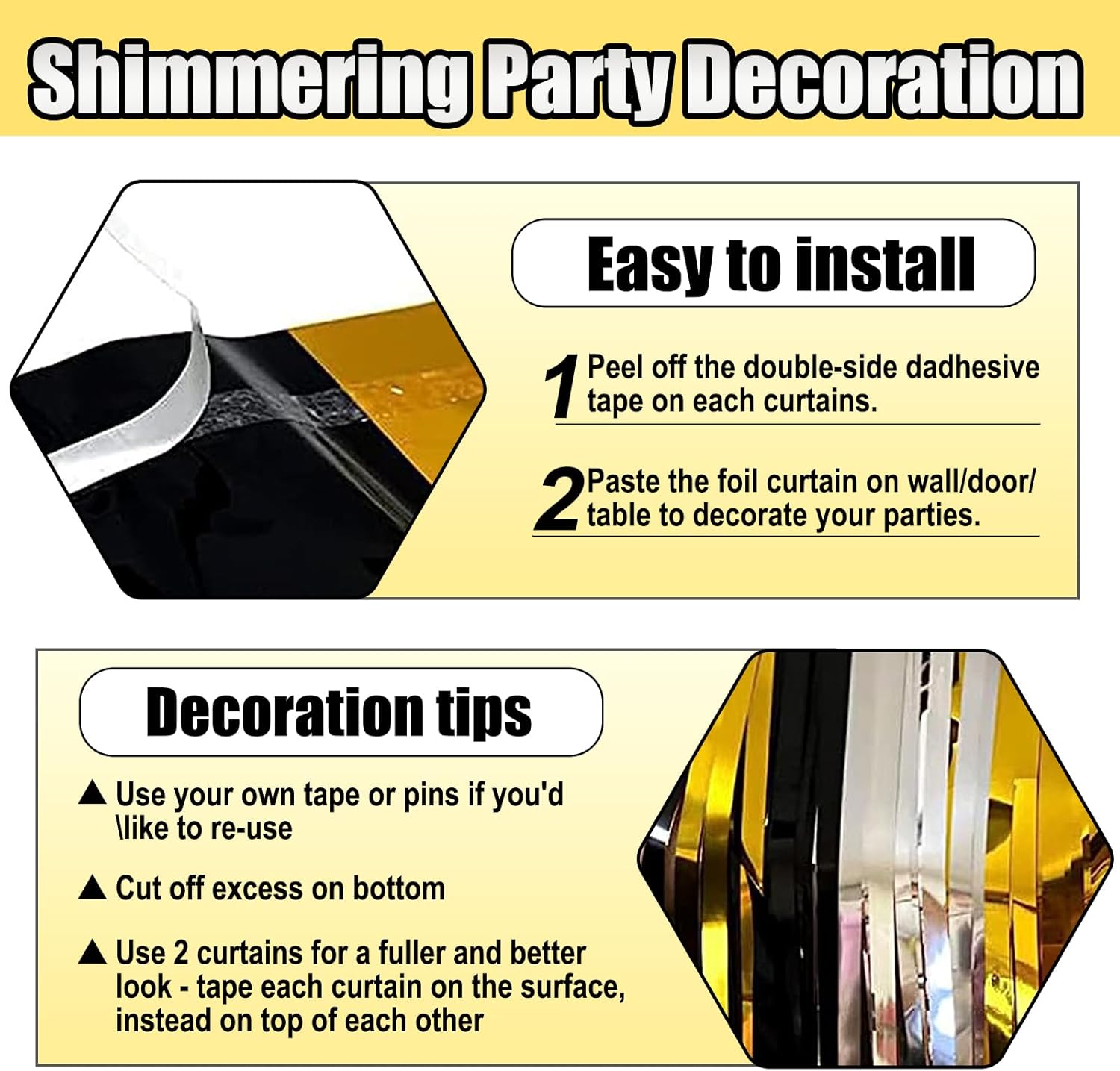 - Easy To Assemble | Strong Adhesive | Not Easy Fade : The foil fringe curtain backdrop party decorations come with double-sided adhesive tape, easy to use, just tear off the back of adhesive tape, then paste this streamers backdrop curtains on the top of wall, window, table, or as door fringe decoration.