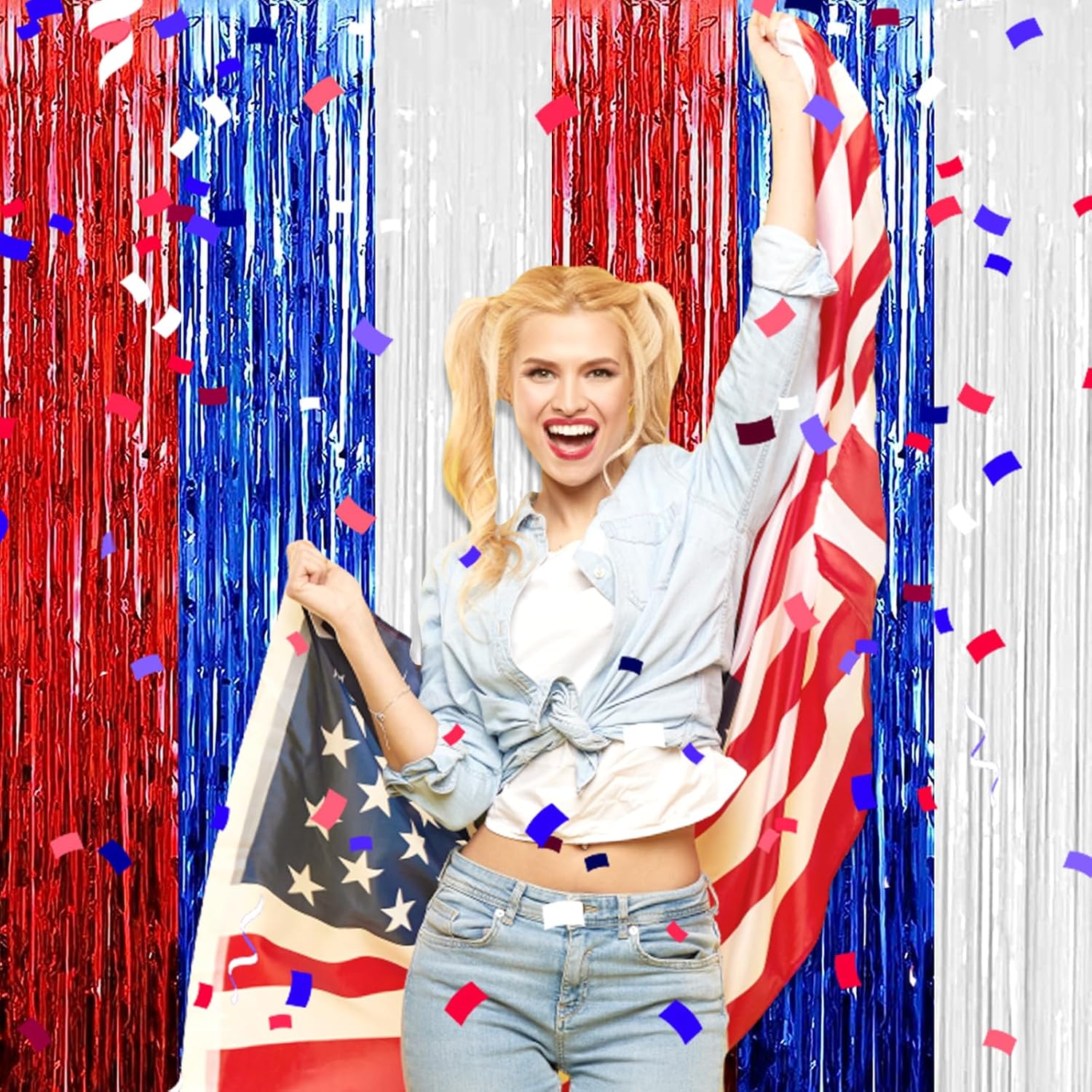 3 Pack White Blue Red Foil Fringe Curtain Backdrop, 3.28Ft x 8.2Ft Metallic Tinsel Foil Fringe Streamer Curtains for Photo Booth, Christmas Day, Thanksgiving, Wedding, New Year Party Decorations