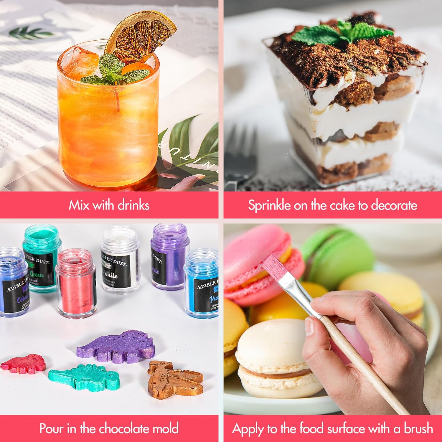 - 🍷【HIGH QUALITY&EASY TO USE】The luster dust edible set has excellent adhesion on both wet and dry media, they have good coloring effects. The powder glitter is very delicate and easy to stir up. You can mix edible luster dust directly with the drink to make a star drink: mix them with vodka, gently stir to get the magic color! You can also sprinkle it directly on the cake for decoration, or you can apply it directly to the mould with a brush to make wonderful chocolate.