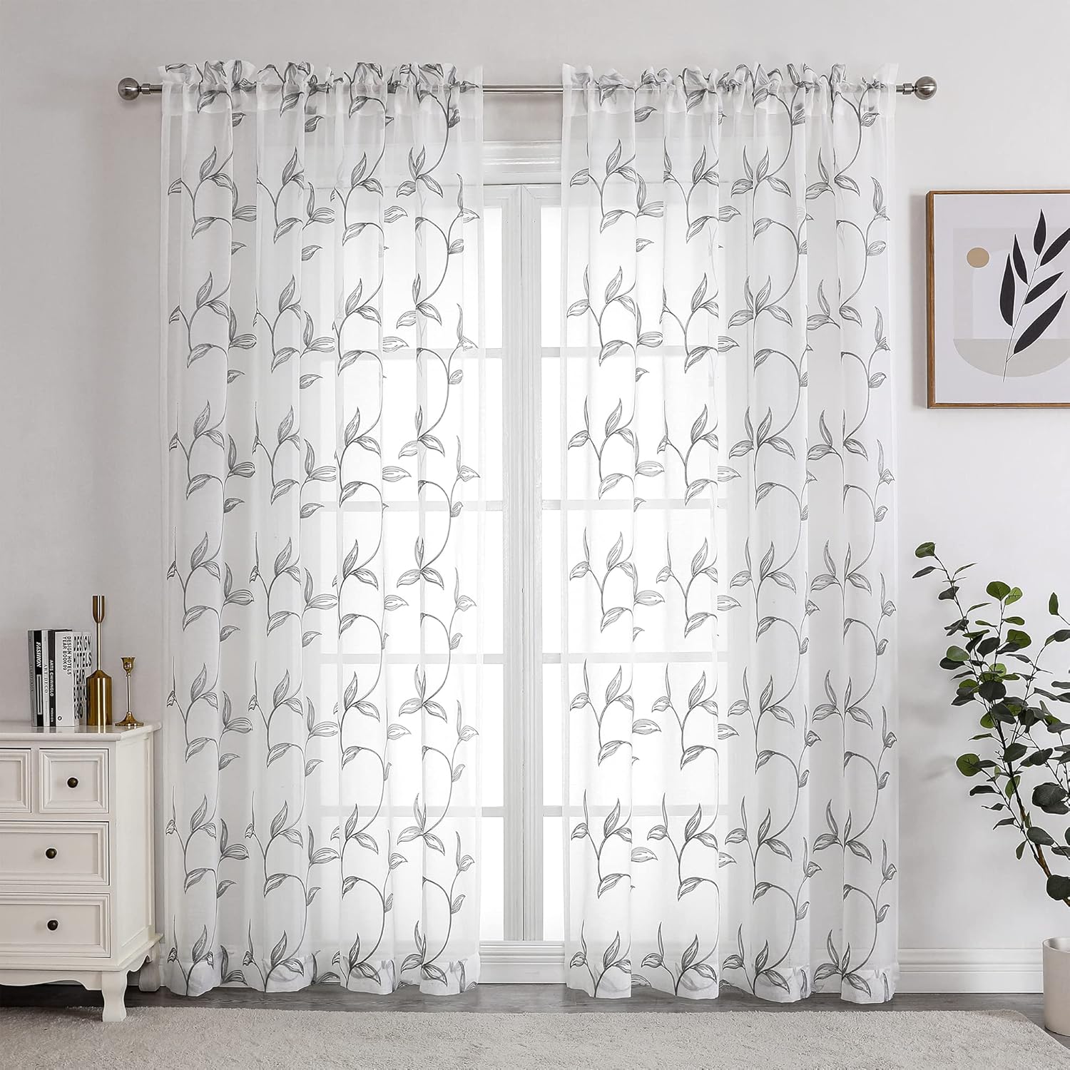 VISIONTEX Sheer Curtains 108 Inch Length 2 Panels, Decor Iron Grey Vine Leaves Embroidery on White Voile Pair, Accent Semi Window Drapes for Kitchen, Living Room and Bedroom, 54" W x 108" L